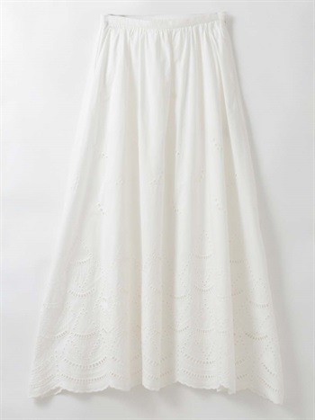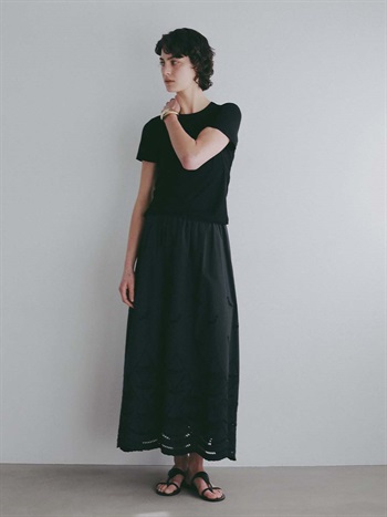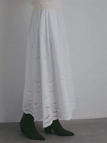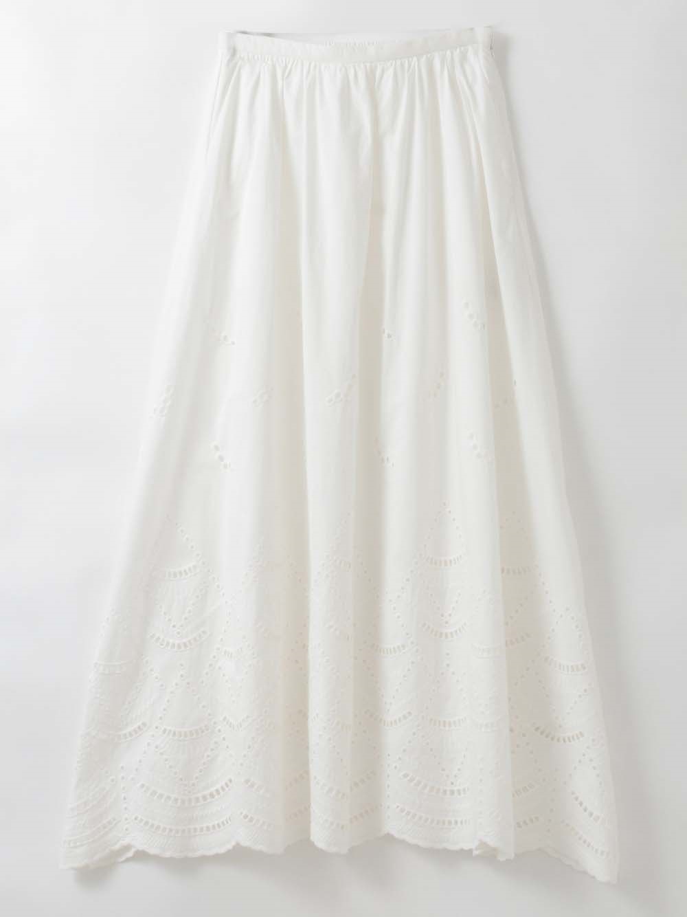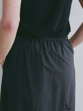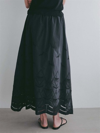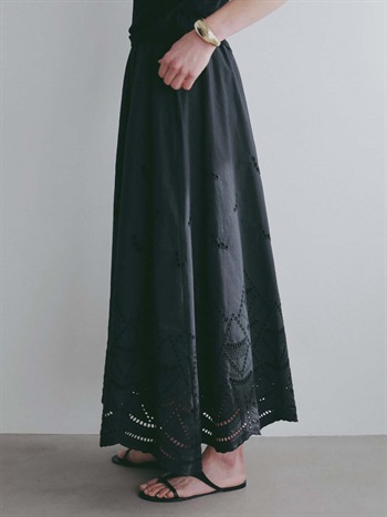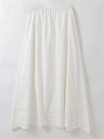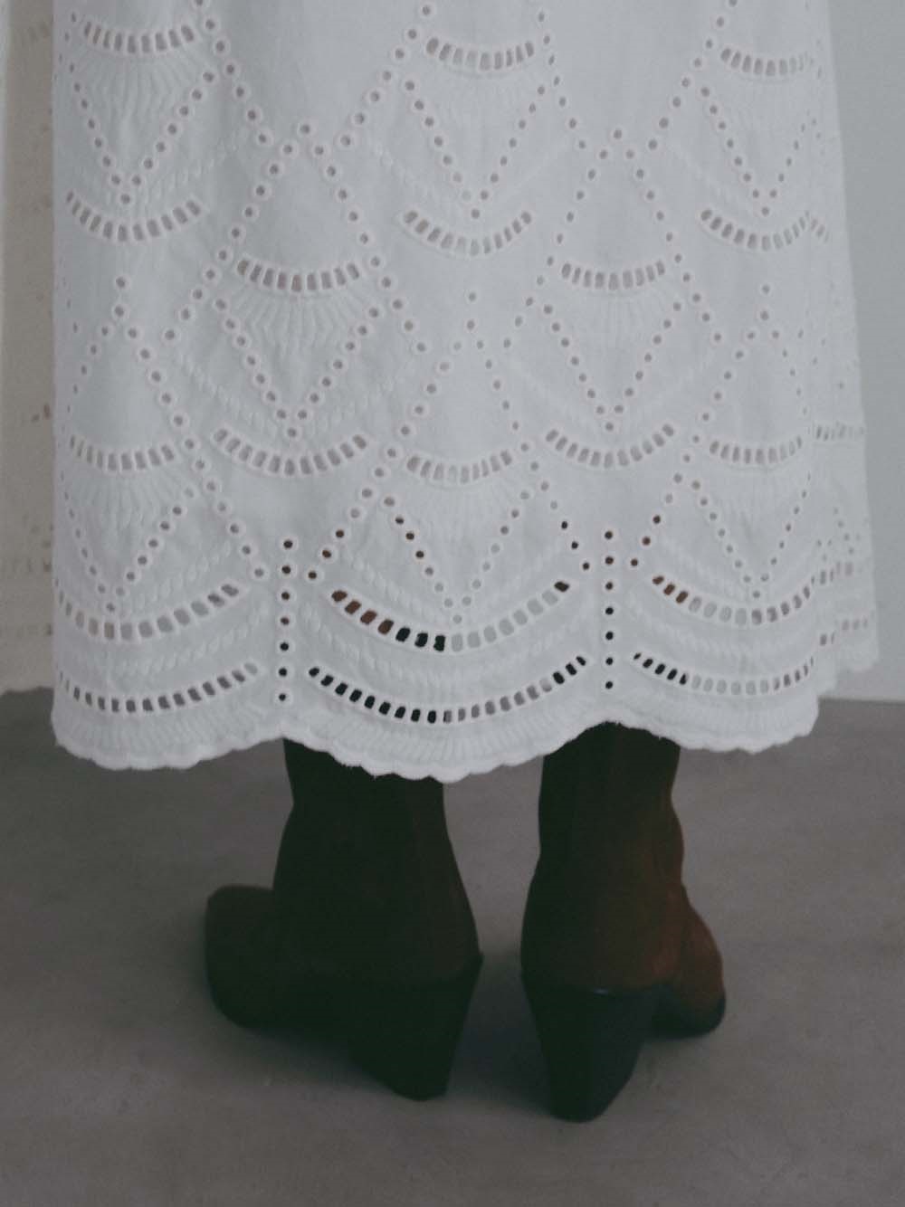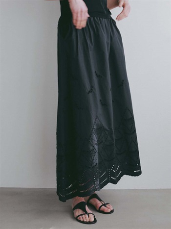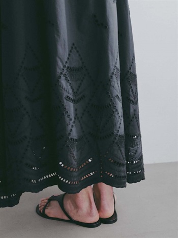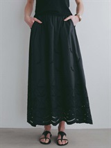 裾から膝上あたりまで刺繍柄を配置し、ウエスト周りは無地のパネル柄で調整。