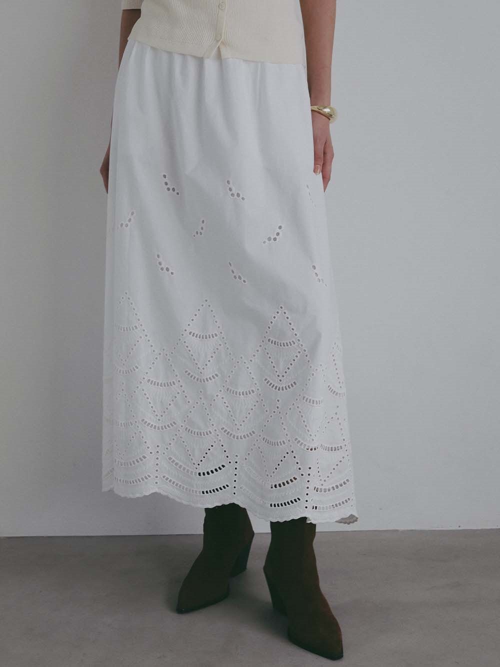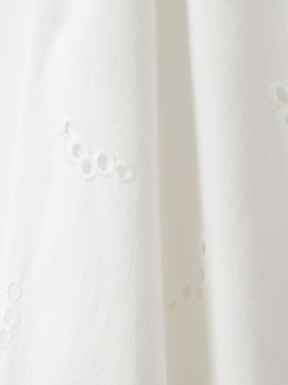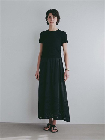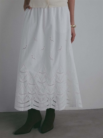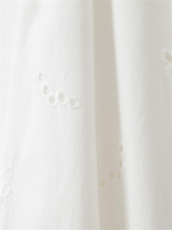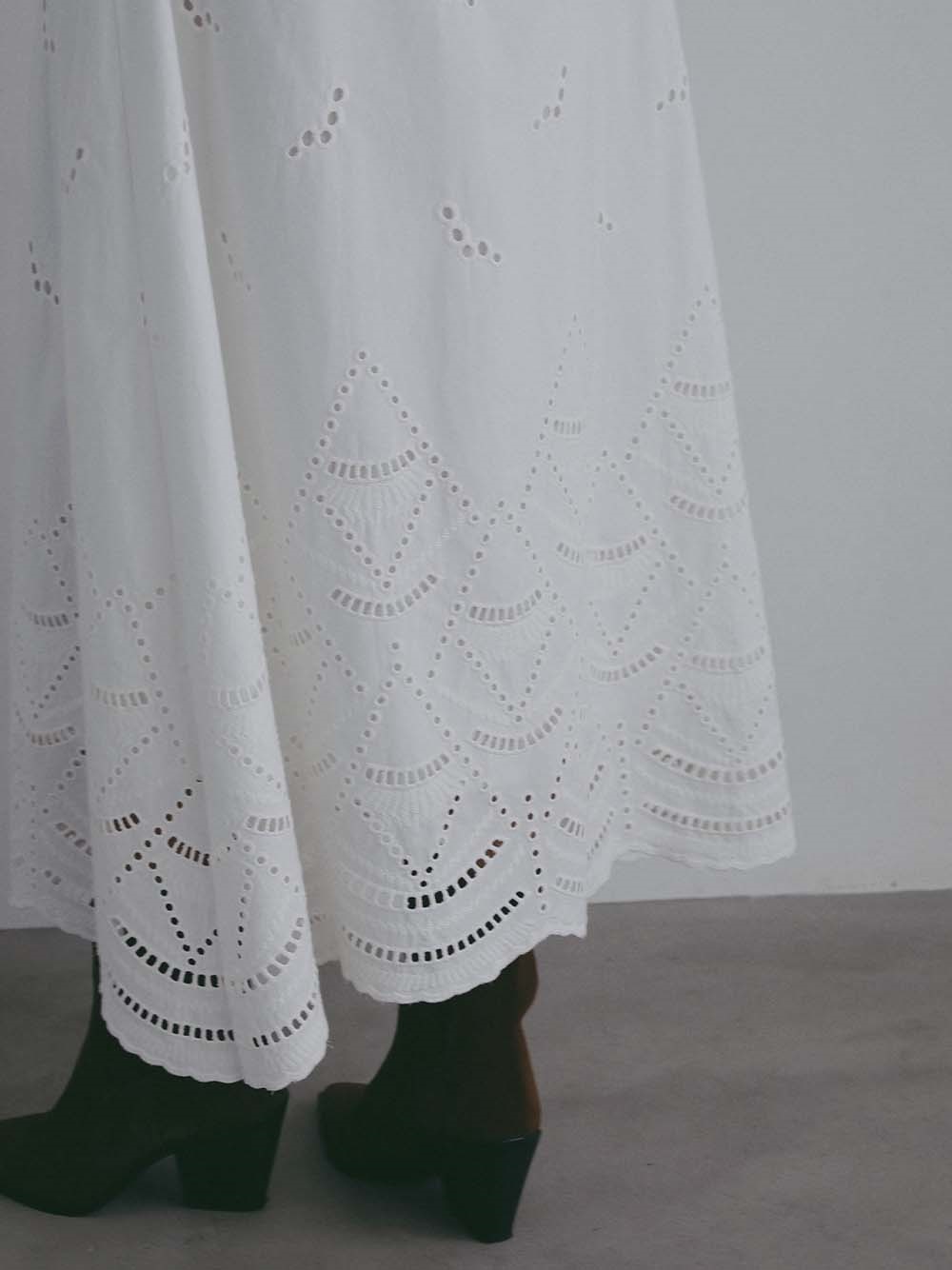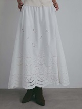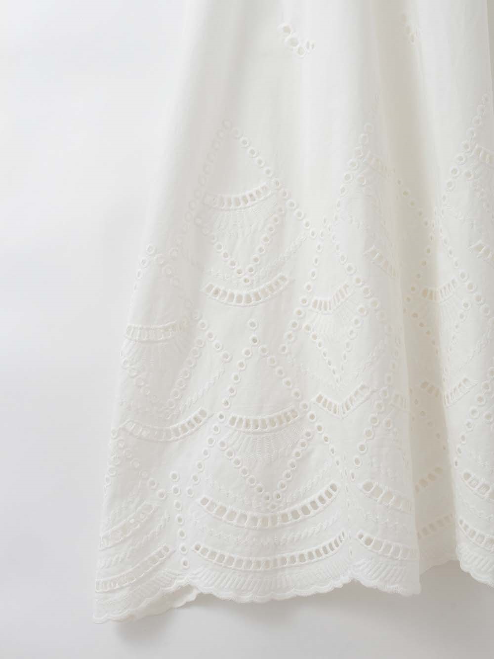 裾から膝上あたりまで刺繍柄を配置し、ウエスト周りは無地のパネル柄で調整。