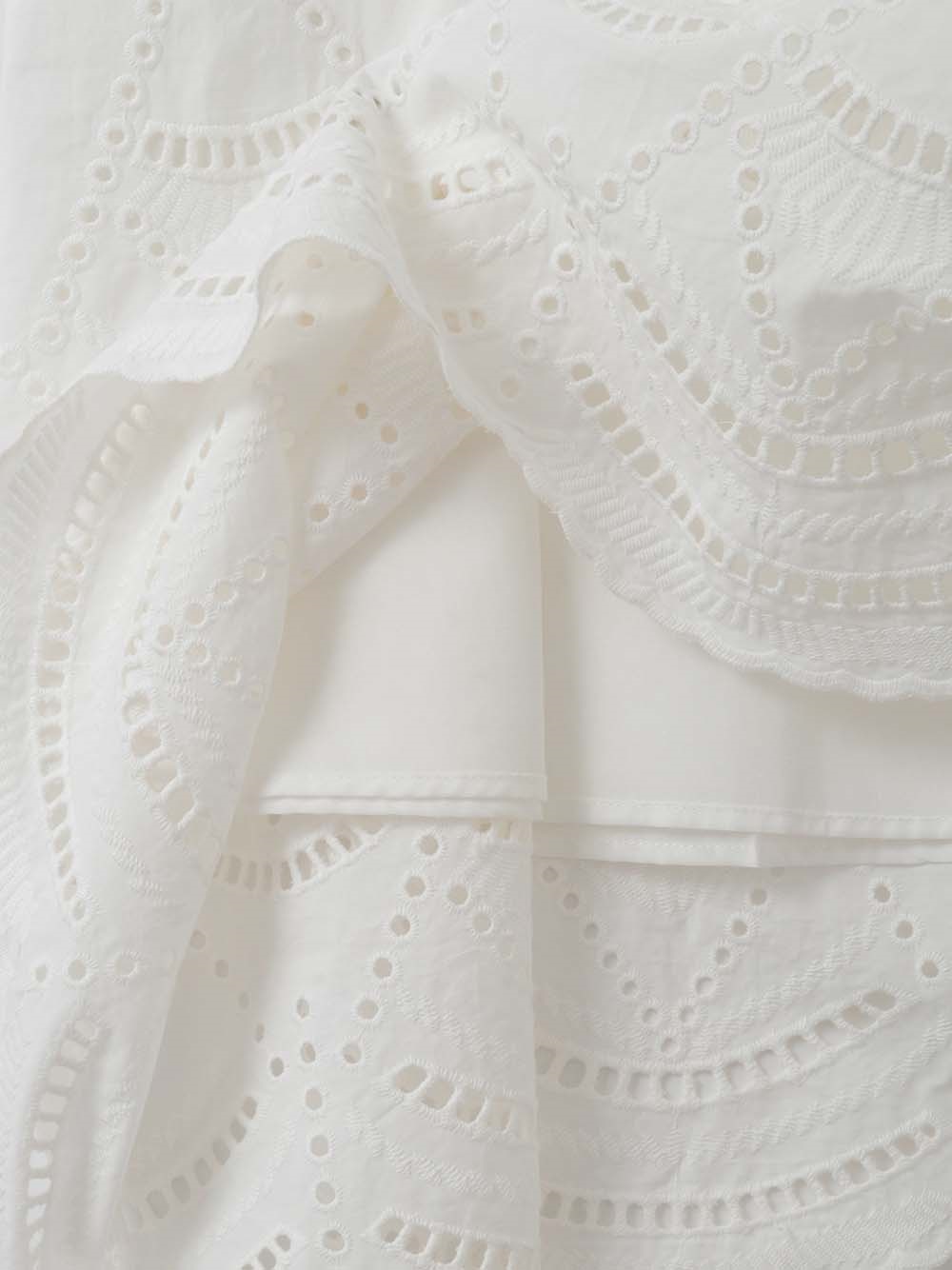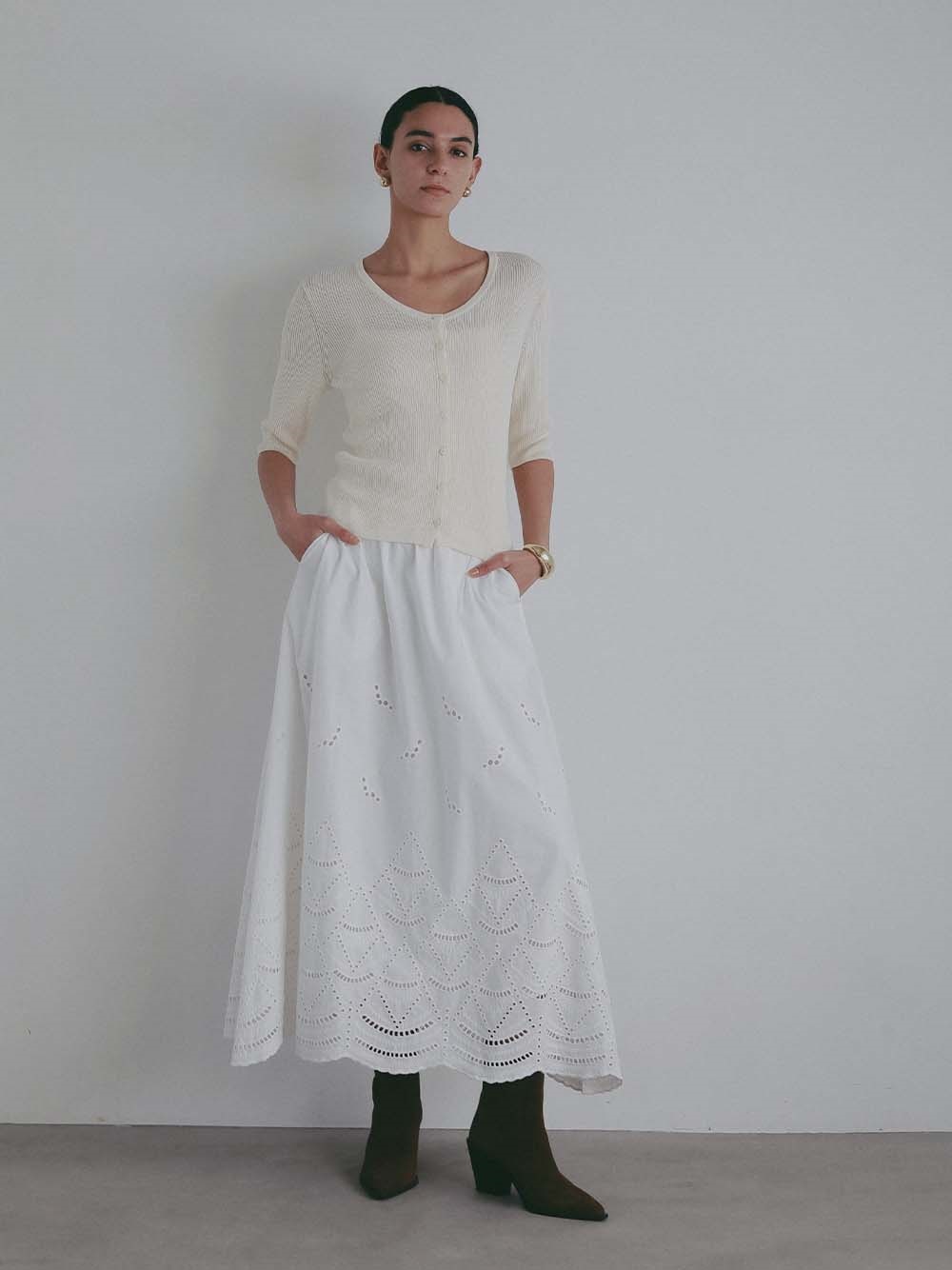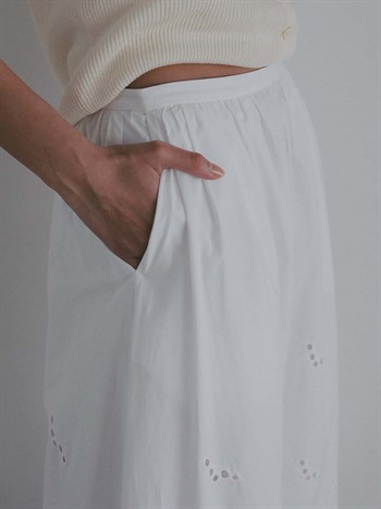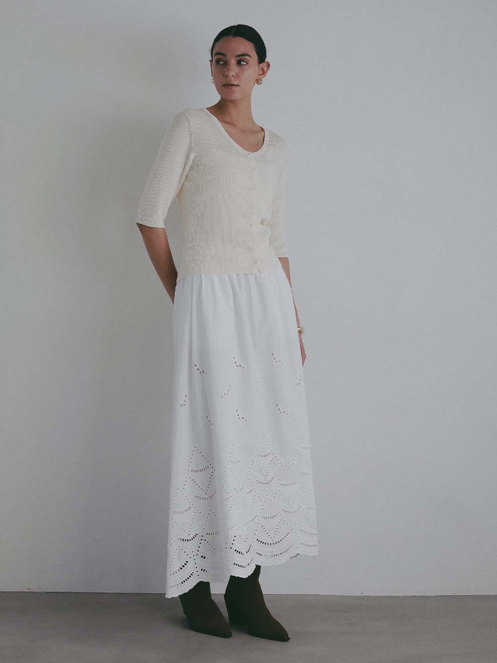 裾から膝上あたりまで刺繍柄を配置し、ウエスト周りは無地のパネル柄で調整。
