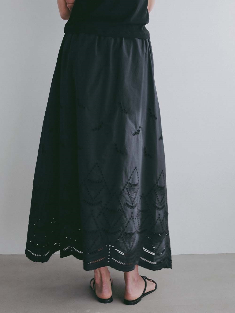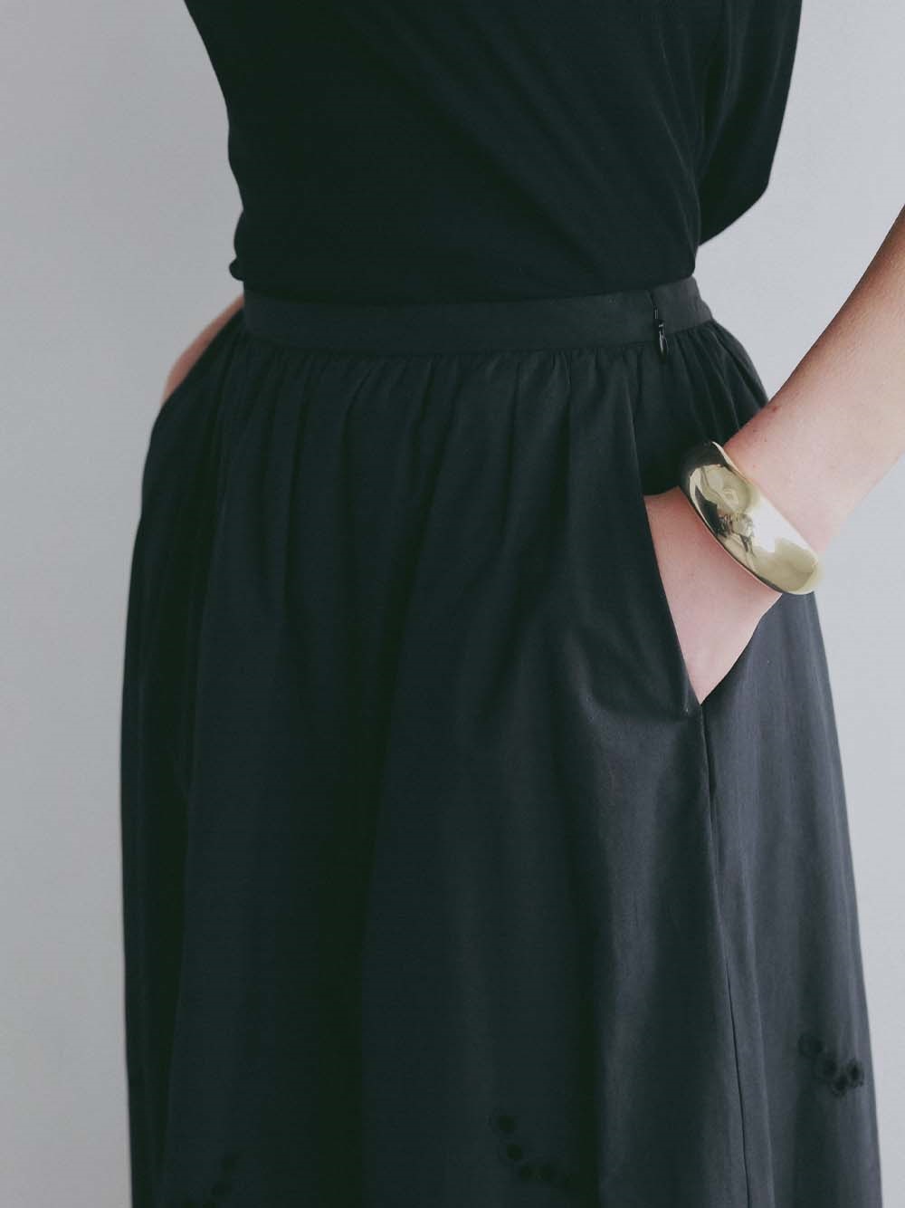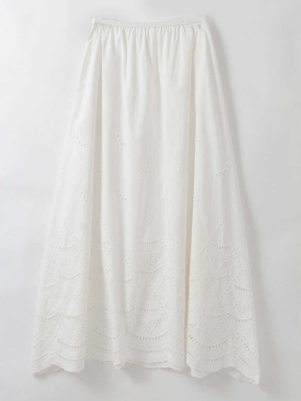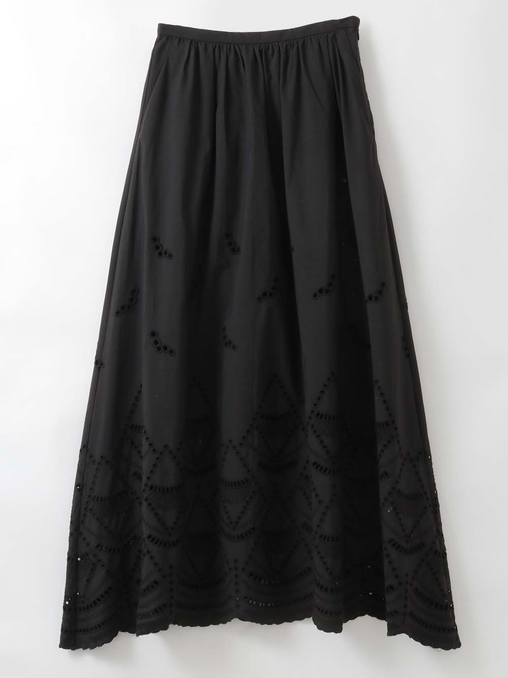 大ぶりな幾何柄のオリジナル刺繍生地のギャザーフレアスカートです。