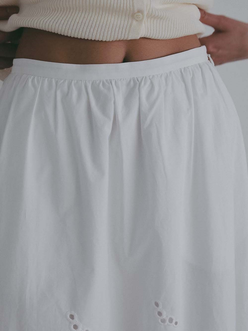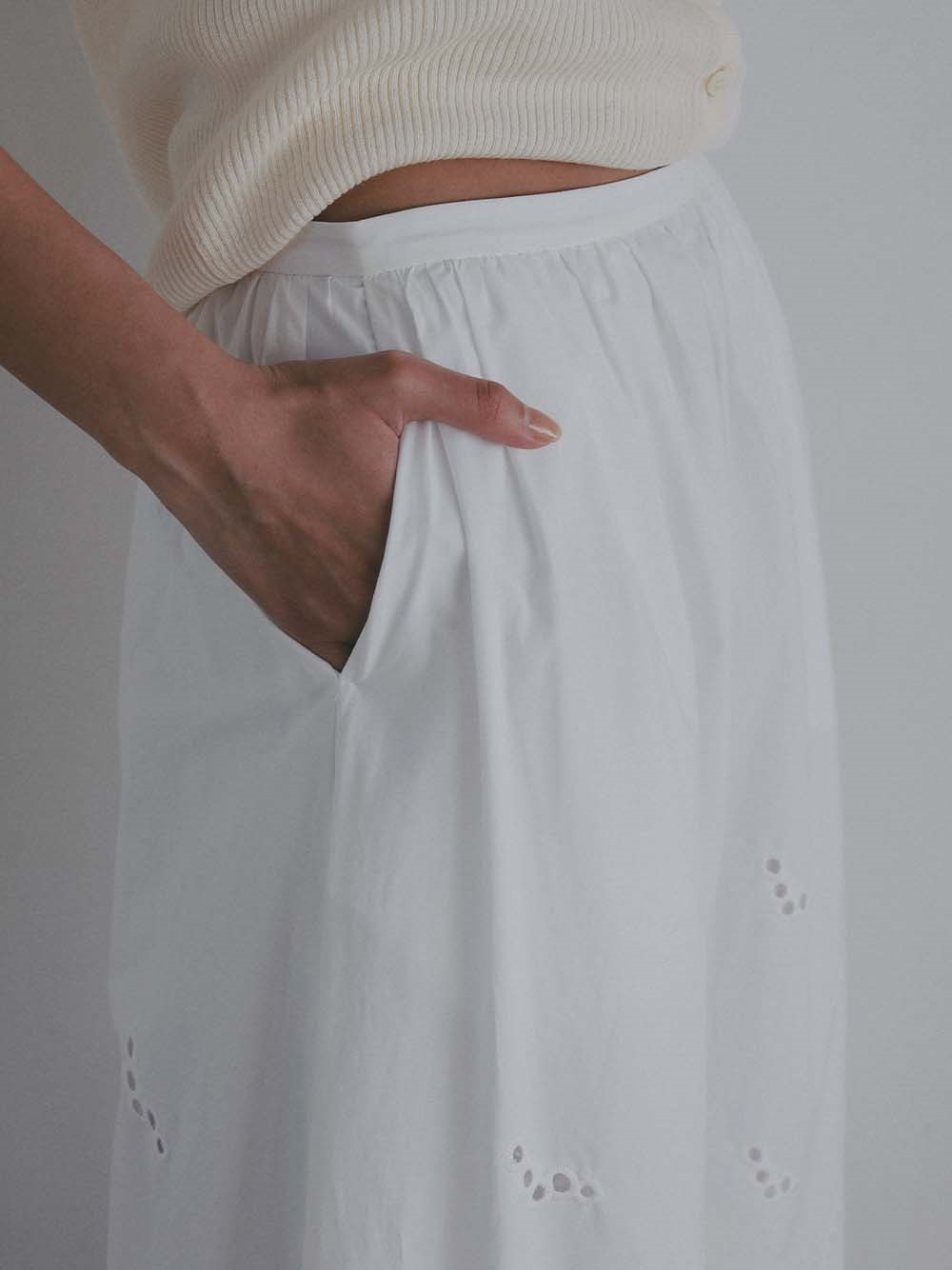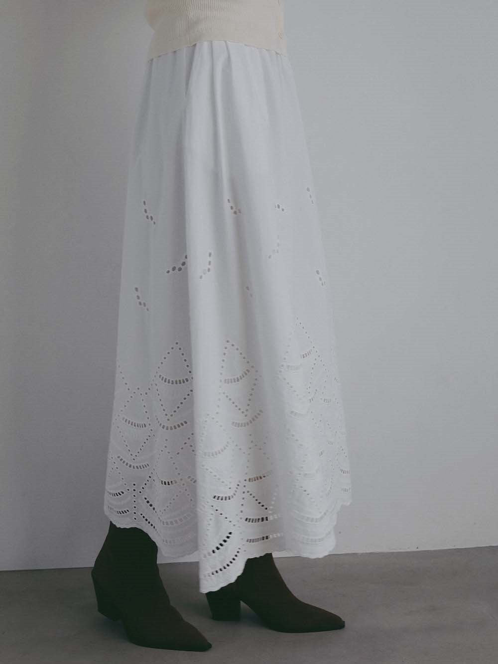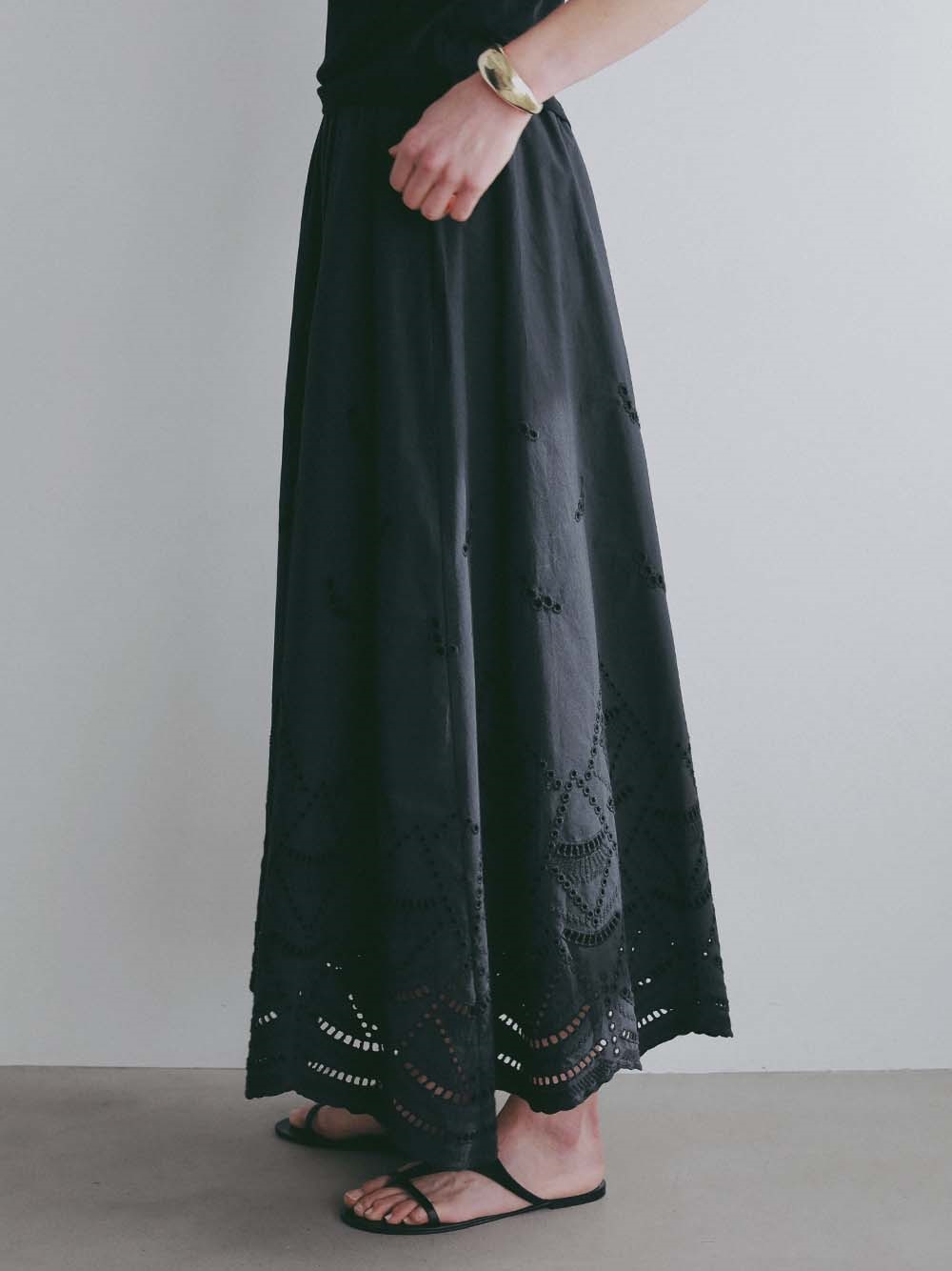 大ぶりな幾何柄のオリジナル刺繍生地のギャザーフレアスカートです。