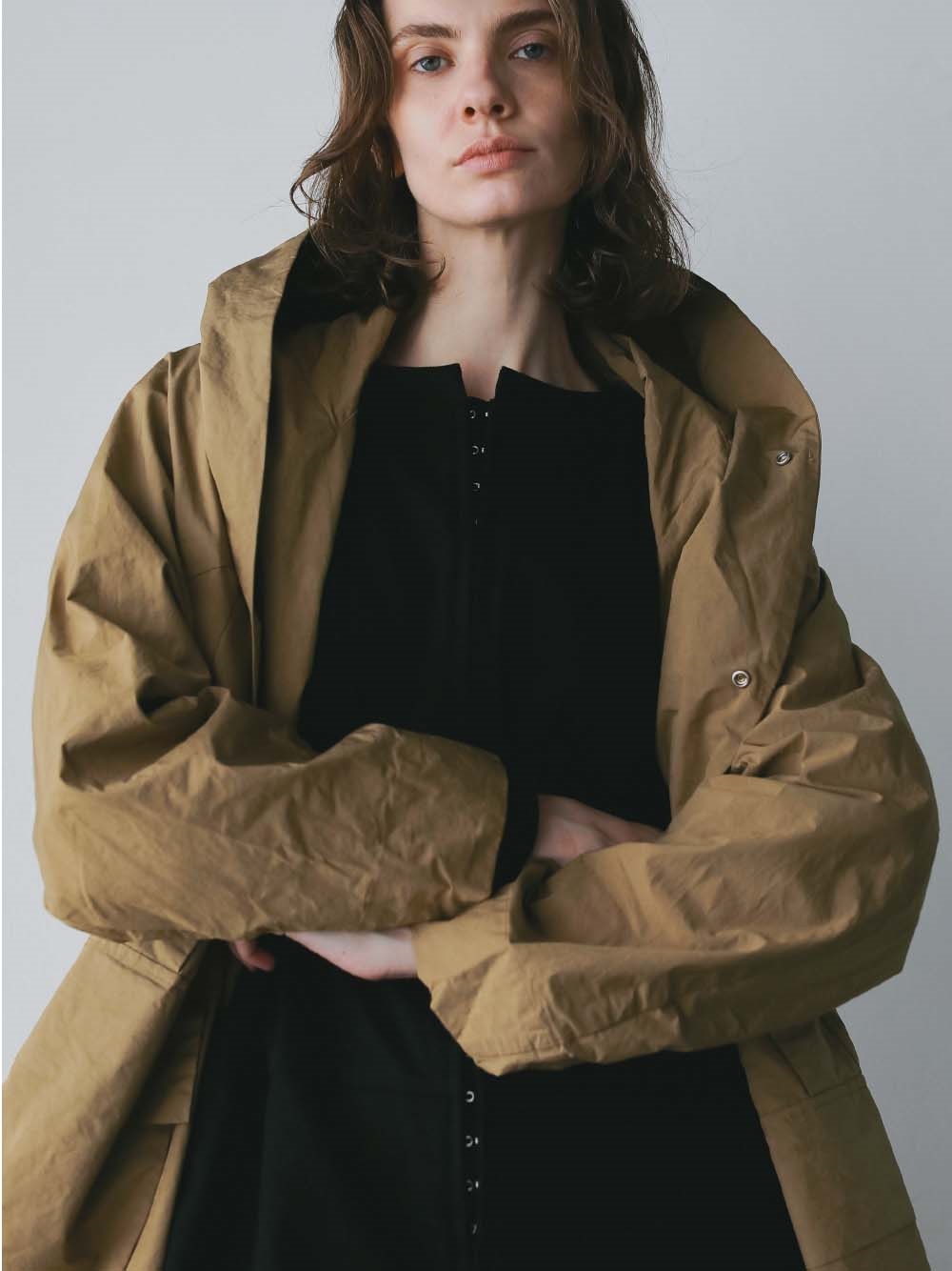 特殊な加工を施した、マットでしっとりとした撥水素材が独特でこなれた雰囲気のコートです。