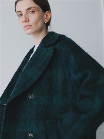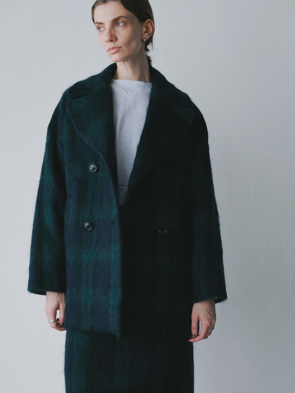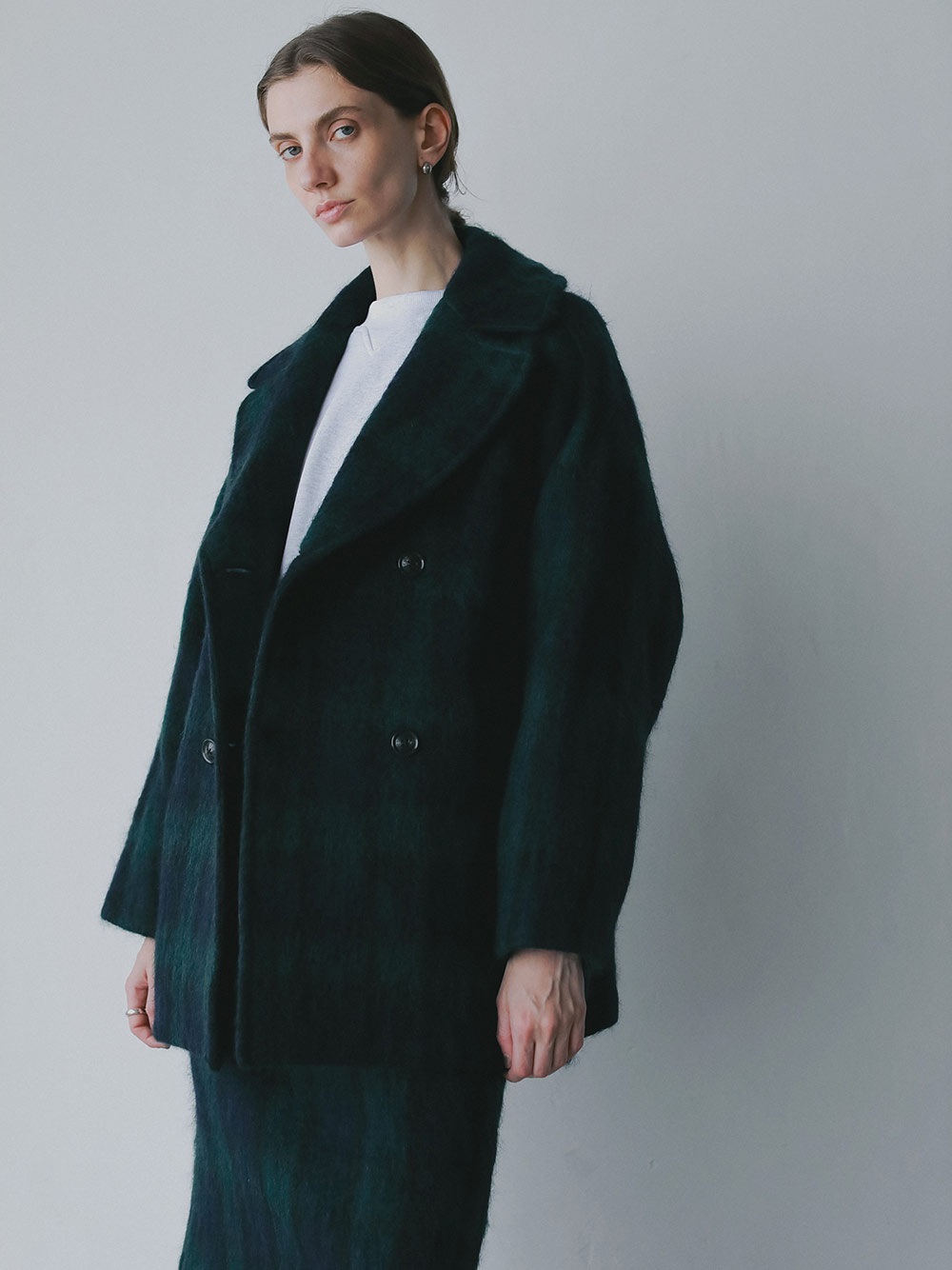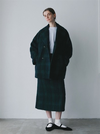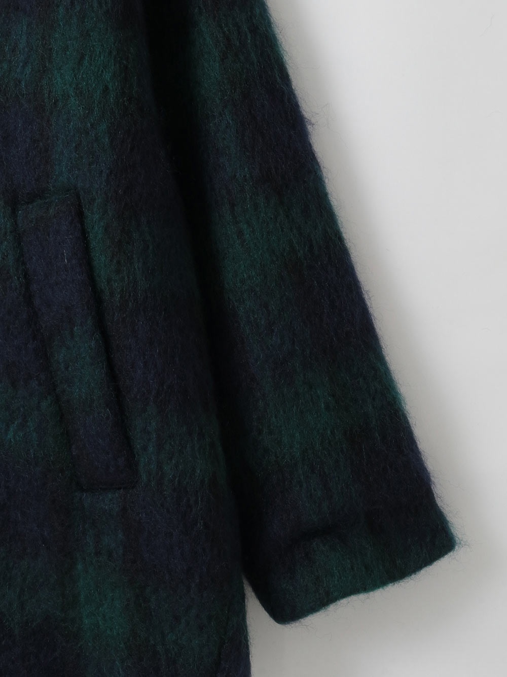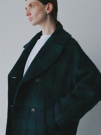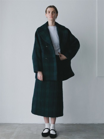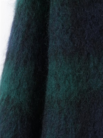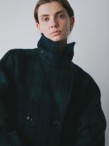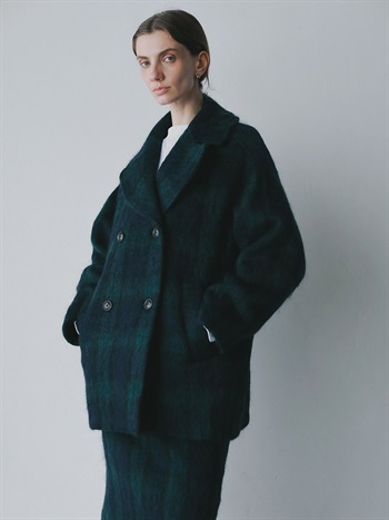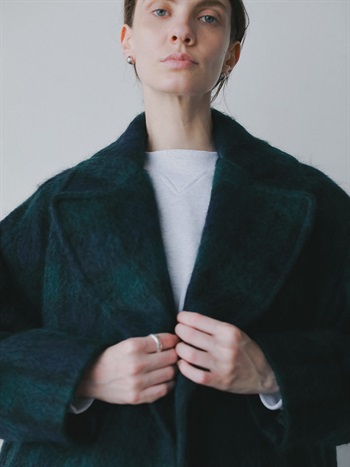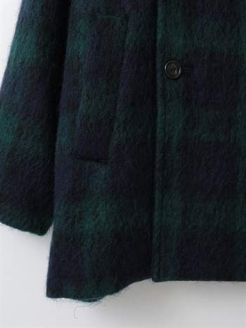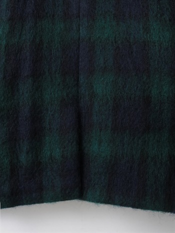 クラシカルなブラックウォッチの品格と、糸自体の持つ華やかさと上品さが特徴のシャギーチェックです。縦横に1/3番の糸を使用することで太番手からなるふくらみ感が特徴です。またモヘアが高混率でしっかりと入っていることでモヘア特有の上品な光沢感と艶感、しなやかな反発性がいきています。しっかりと打ち込みがありながら固くなりすぎずよりふくらみ感があり、唯一無二の仕上がりが魅力の生地です。