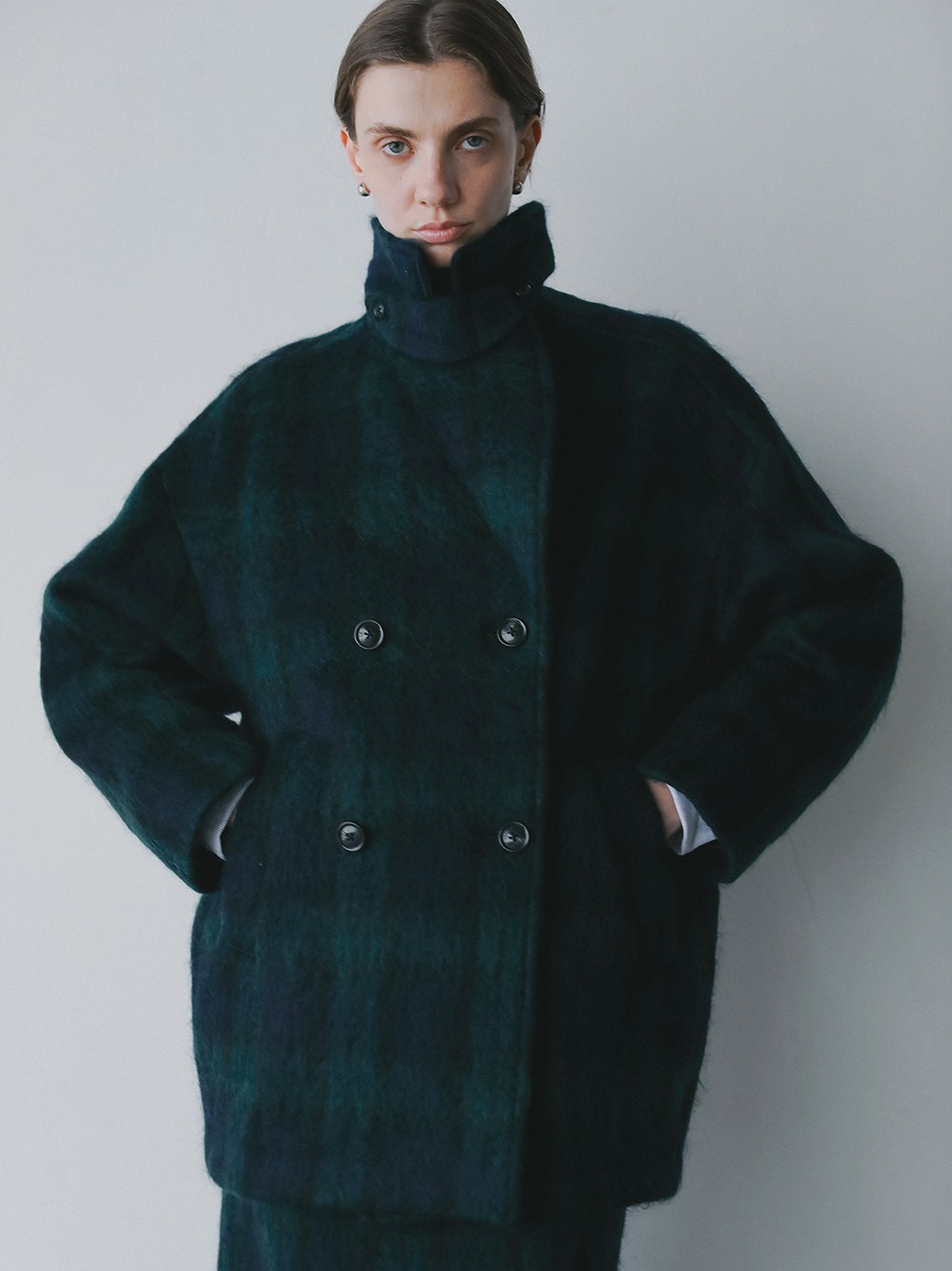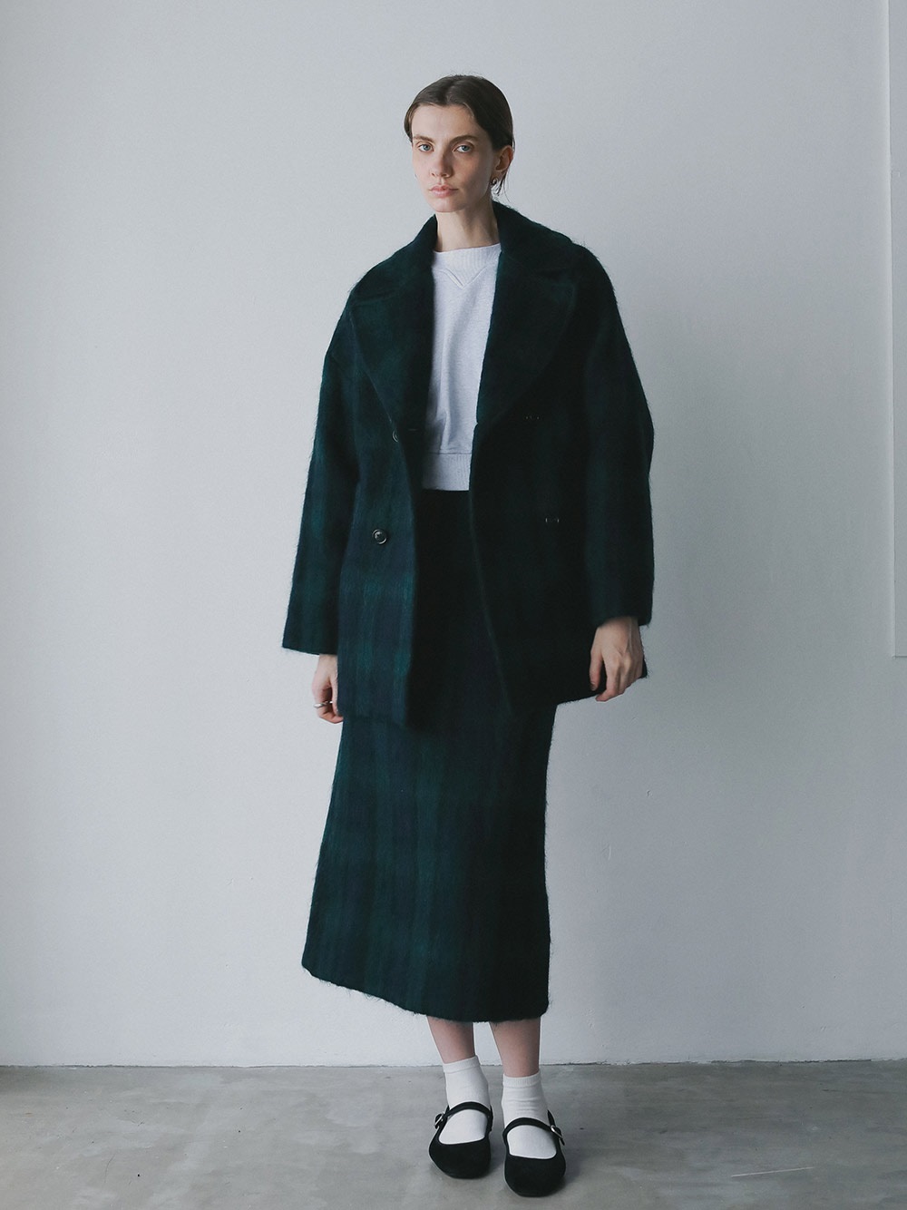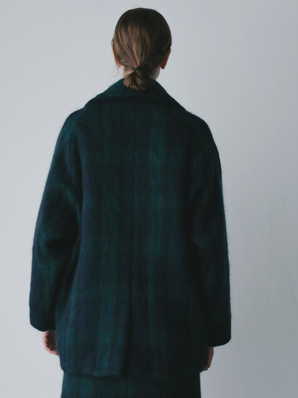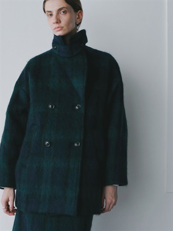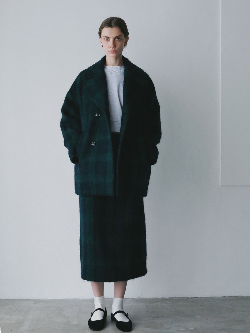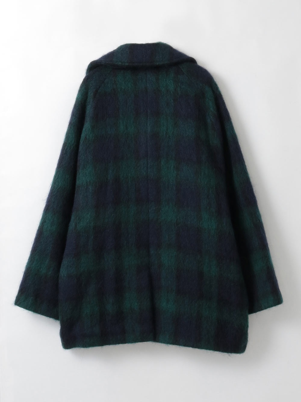 クラシカルなブラックウォッチの品格と、糸自体の持つ華やかさと上品さが特徴のシャギーチェックです。縦横に1/3番の糸を使用することで太番手からなるふくらみ感が特徴です。またモヘアが高混率でしっかりと入っていることでモヘア特有の上品な光沢感と艶感、しなやかな反発性がいきています。しっかりと打ち込みがありながら固くなりすぎずよりふくらみ感があり、唯一無二の仕上がりが魅力の生地です。
