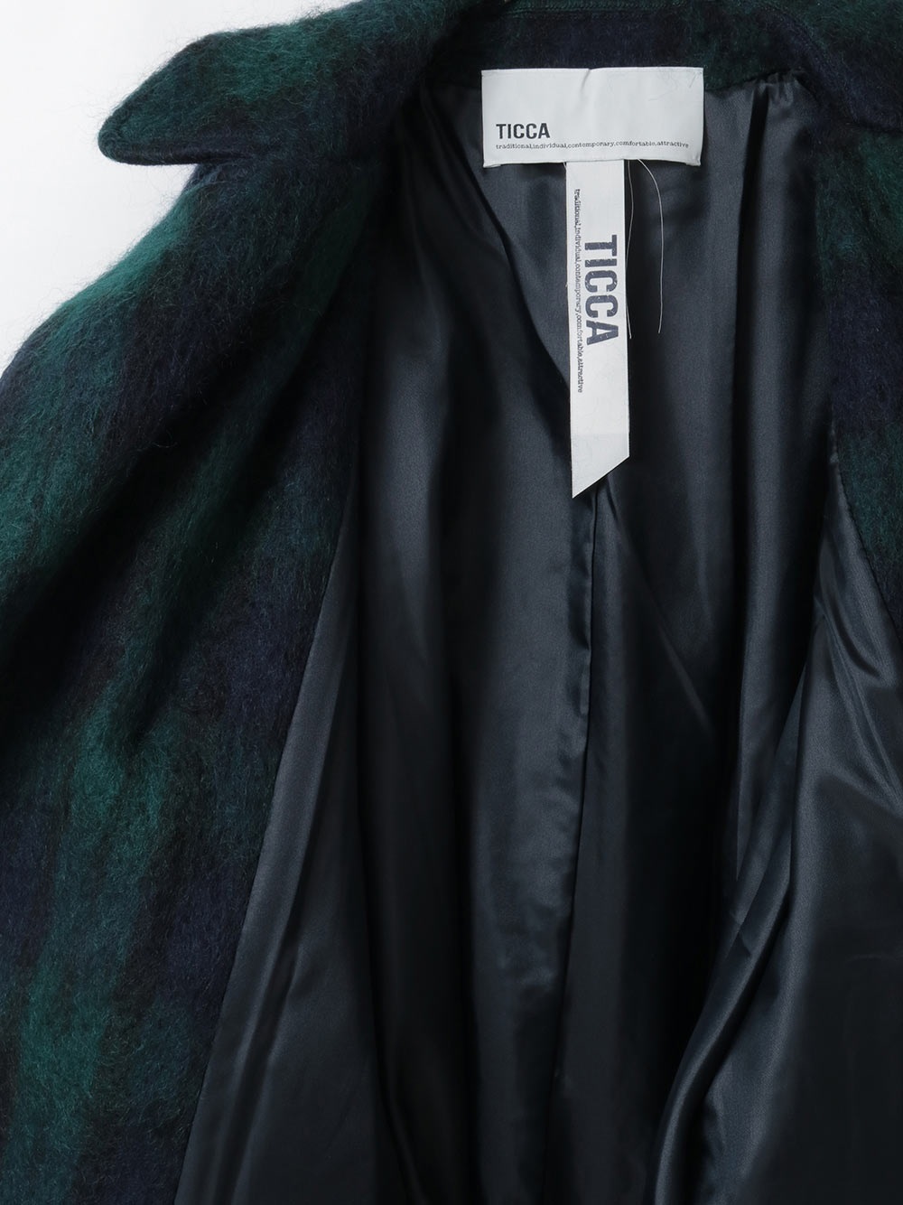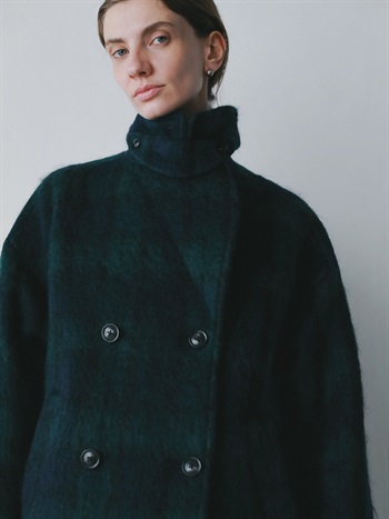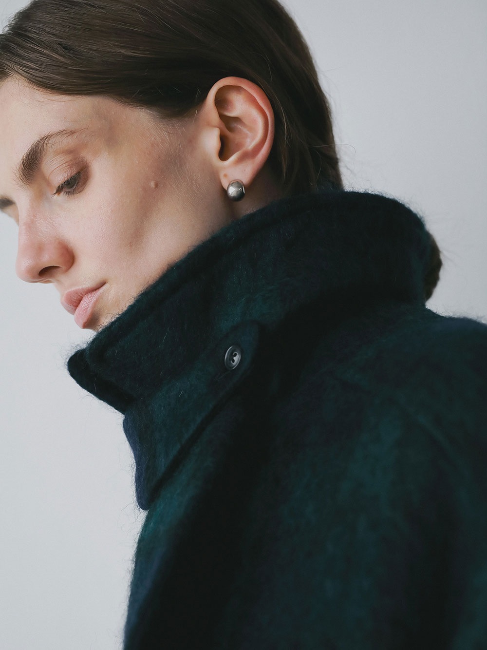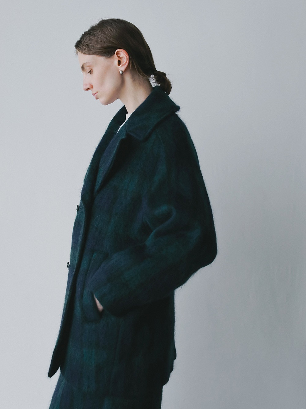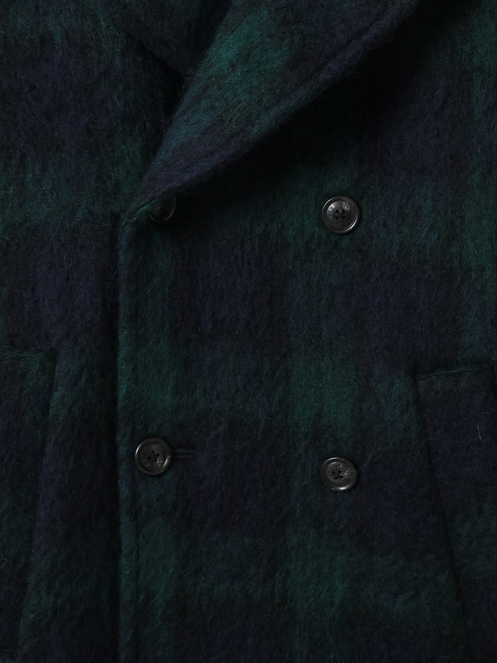 クラシカルなブラックウォッチの品格と、糸自体の持つ華やかさと上品さが特徴のシャギーチェックです。縦横に1/3番の糸を使用することで太番手からなるふくらみ感が特徴です。またモヘアが高混率でしっかりと入っていることでモヘア特有の上品な光沢感と艶感、しなやかな反発性がいきています。しっかりと打ち込みがありながら固くなりすぎずよりふくらみ感があり、唯一無二の仕上がりが魅力の生地です。