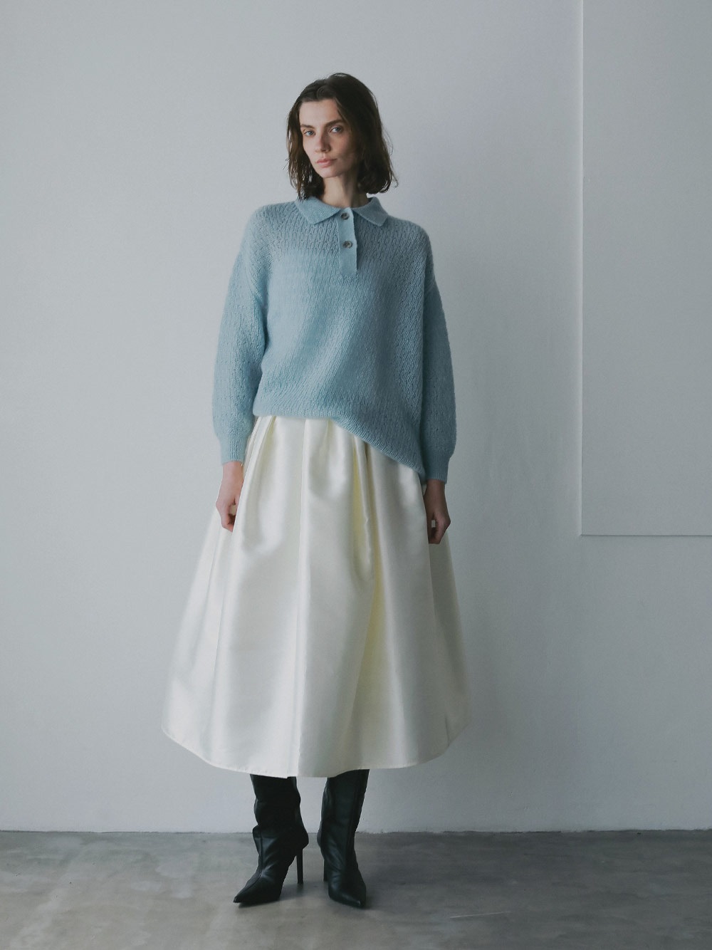 シグネチャーのハンドニットをメインに2019AWスタート。国内生産にこだわり布帛・カット・ニットの知識を生かして機械編みだけではなく、背景の数少ないハンドニットや家庭機、手横機を生かしたニットを多く展開する。