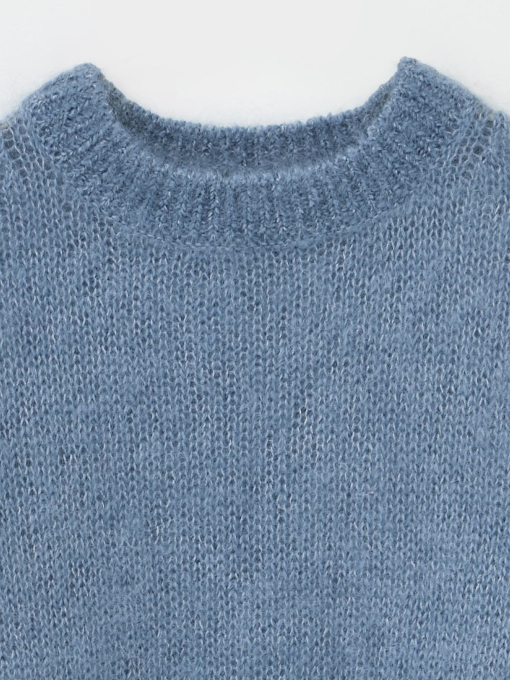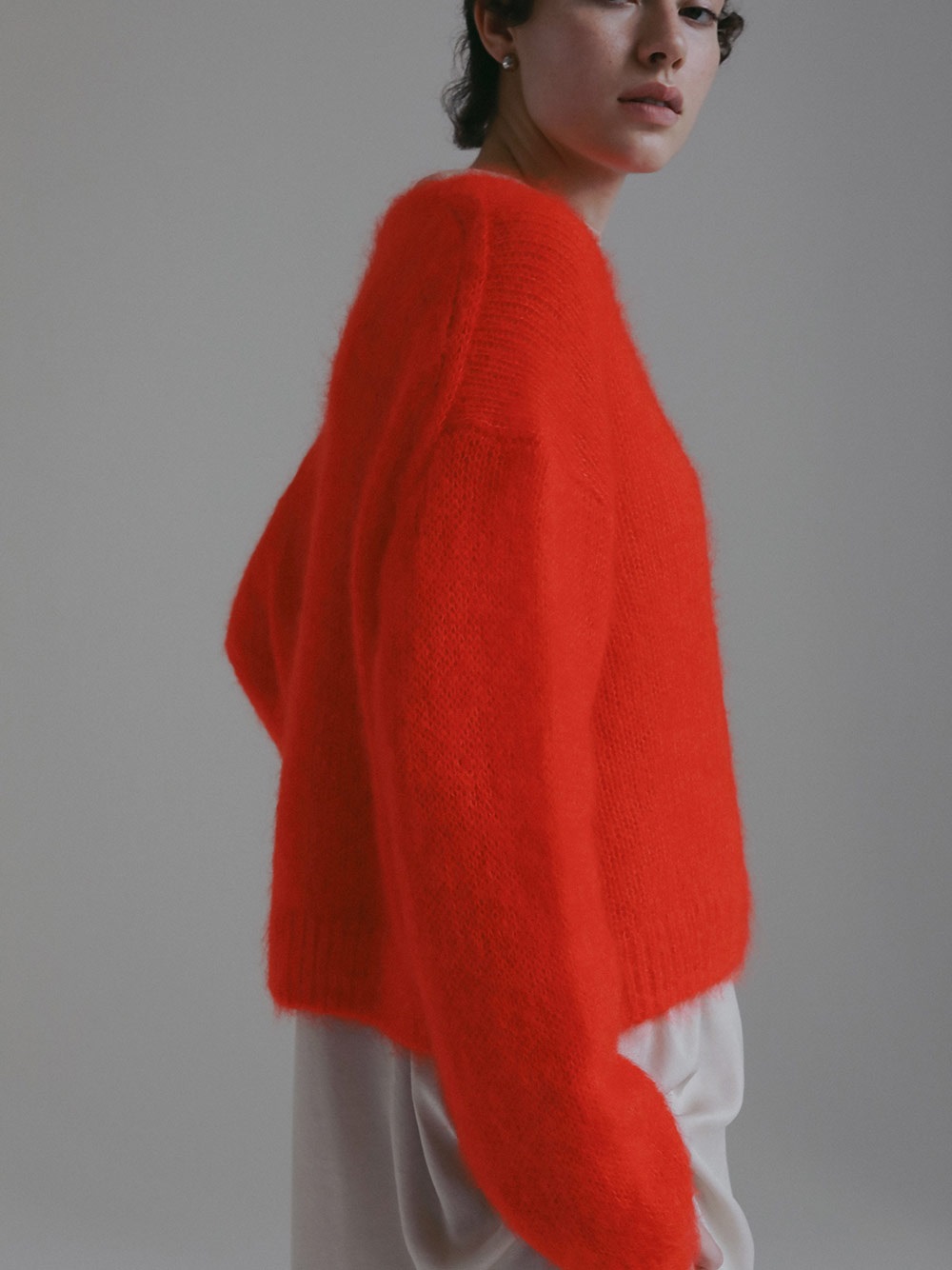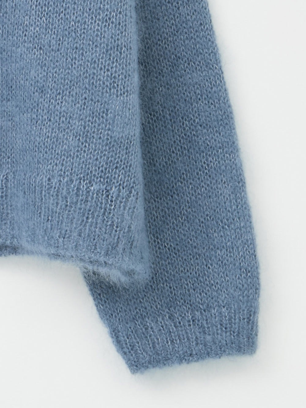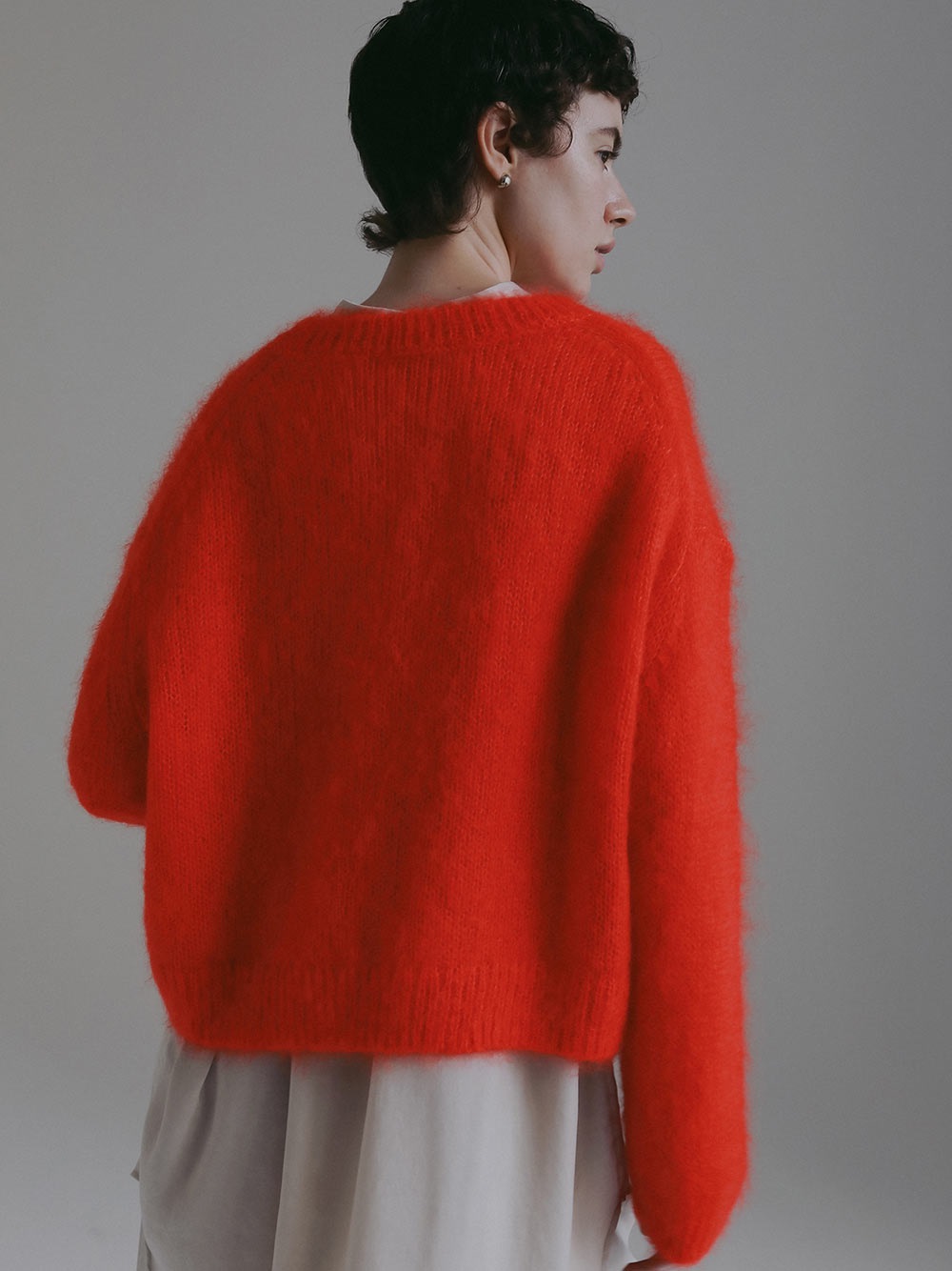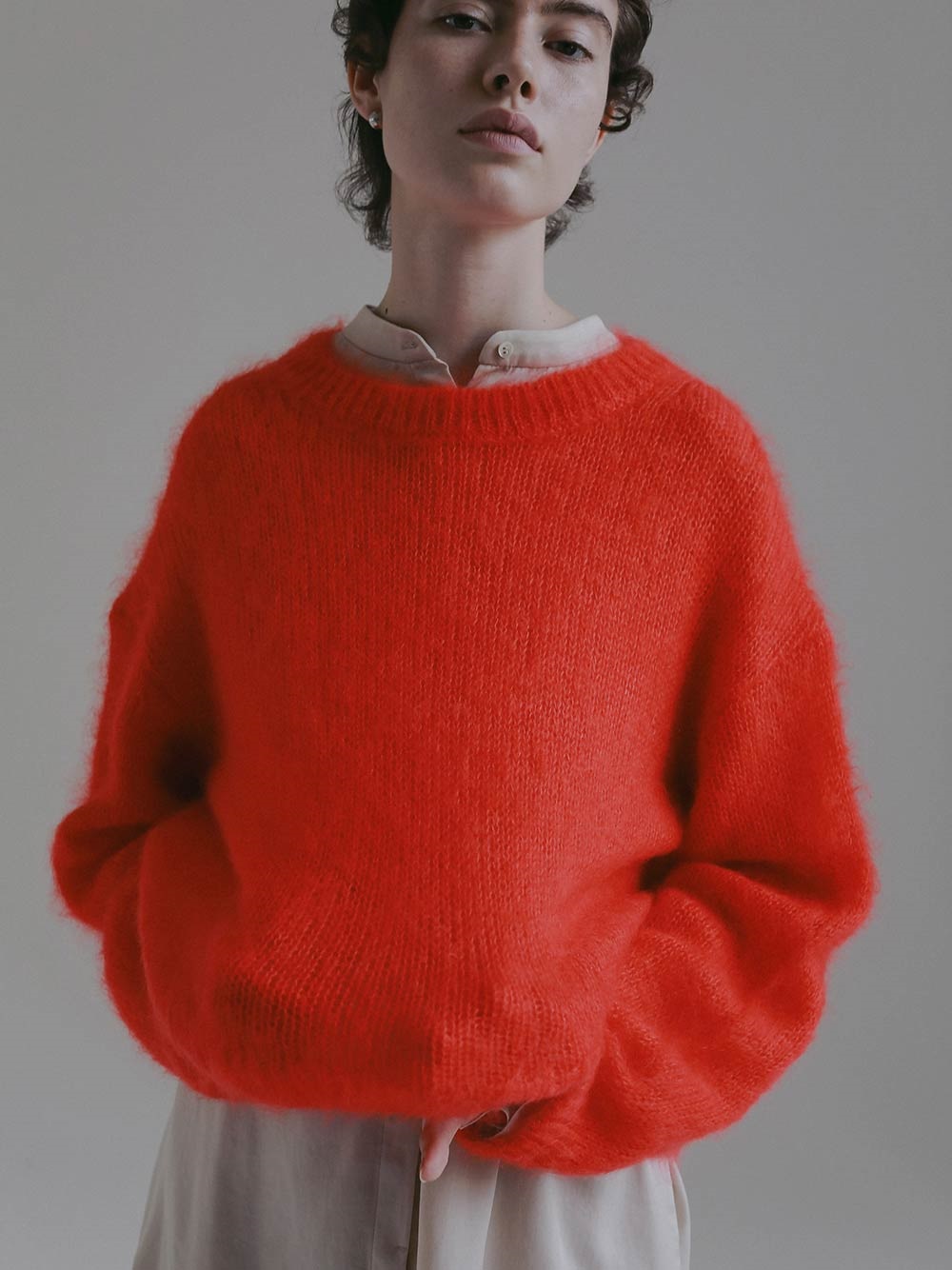 キッドモヘアとシルクが織り成す信じられないほどの柔らかさと、繊維の自然な風合いが最も愛らしい側面をエレガントに表現したものです。あえてリブにしまりを持たせずエフォートレスなムードに仕上げたニットプルオーバー。