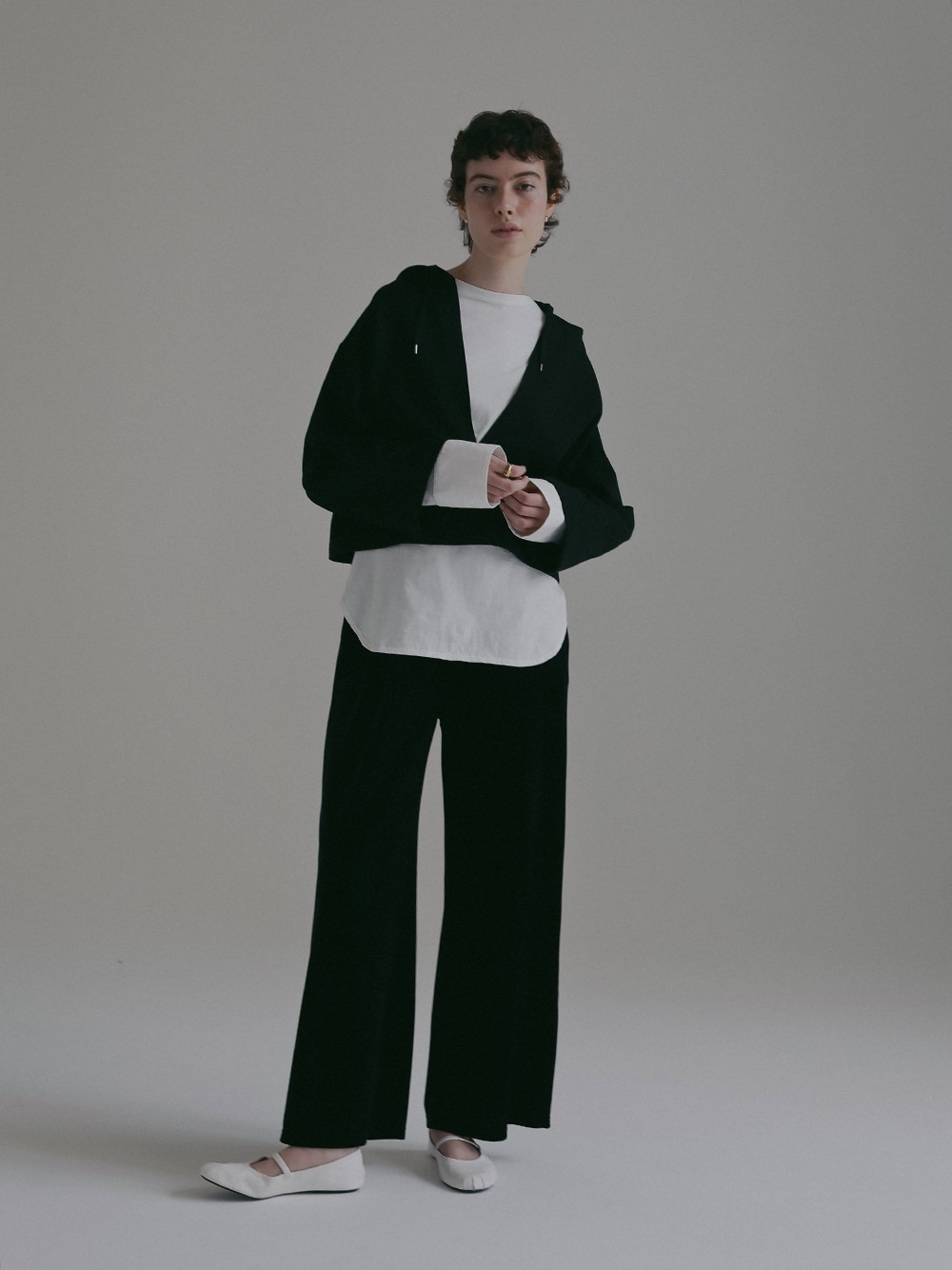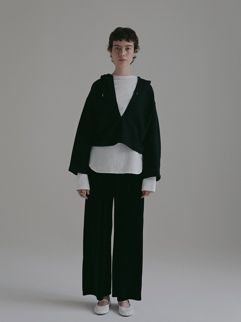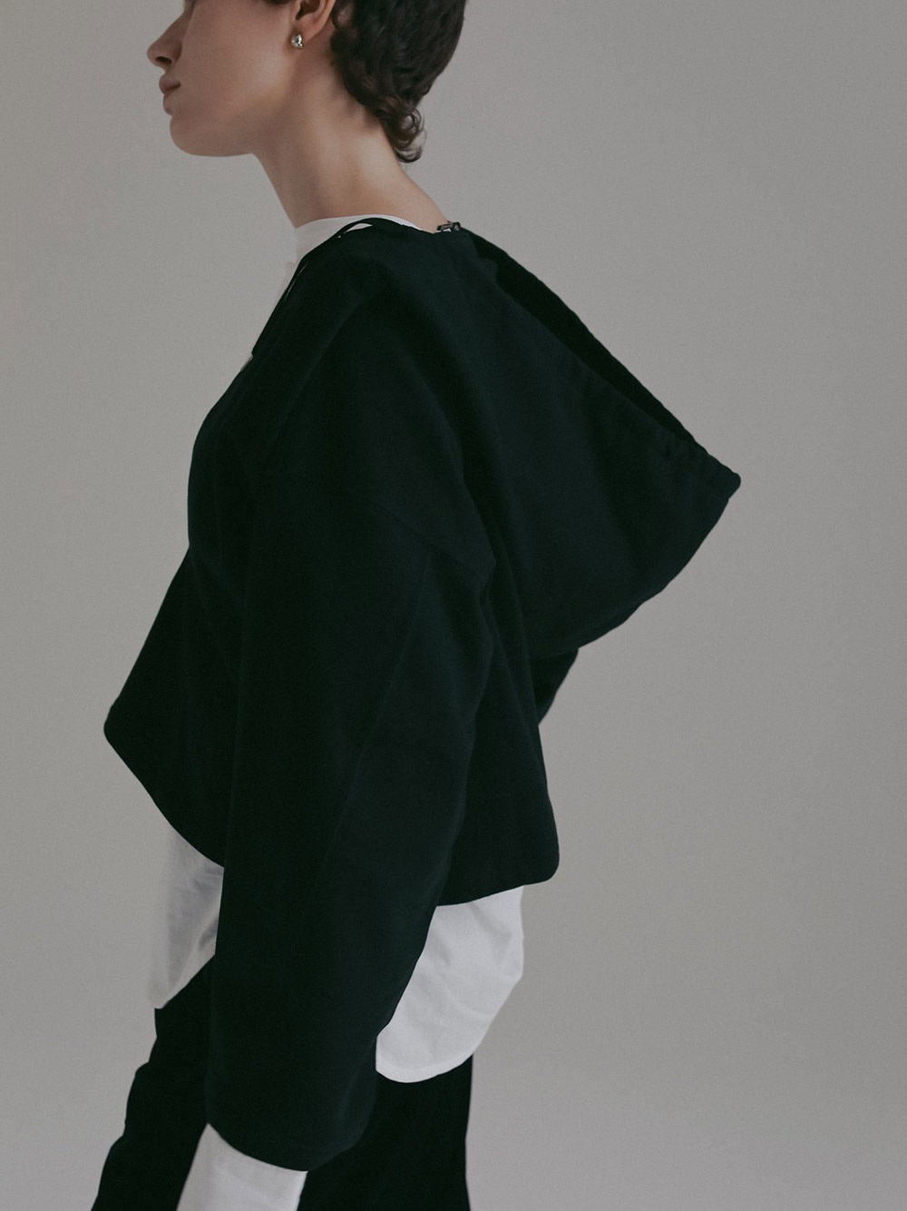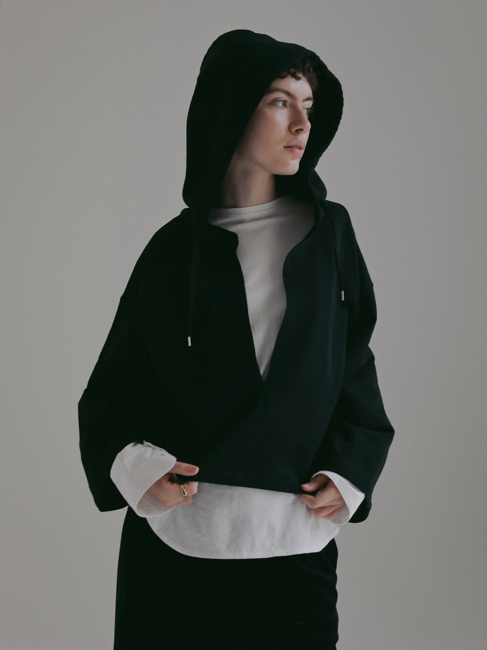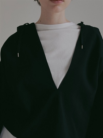前立ての深い切り込みが特徴のフーデットパーカー。