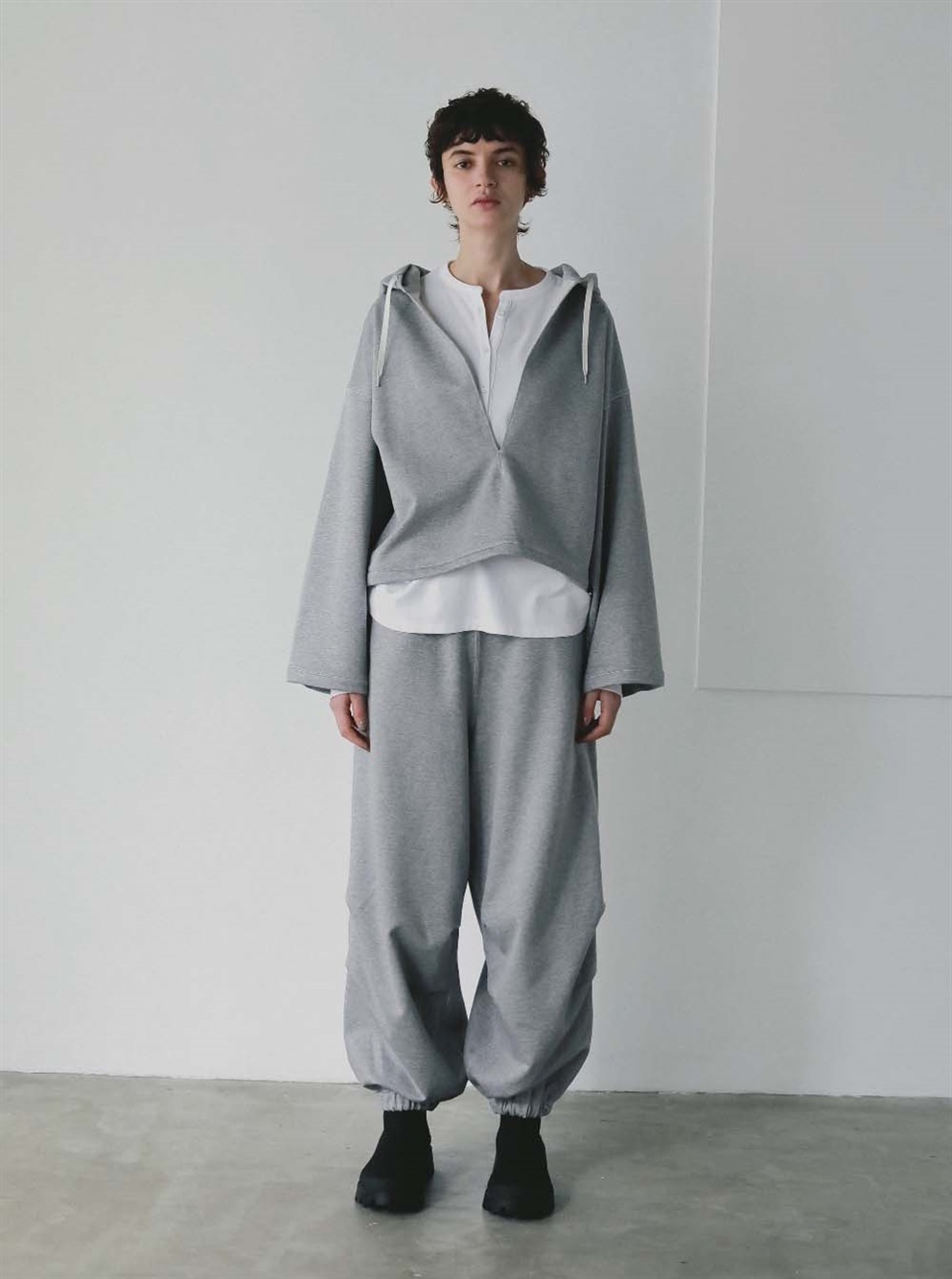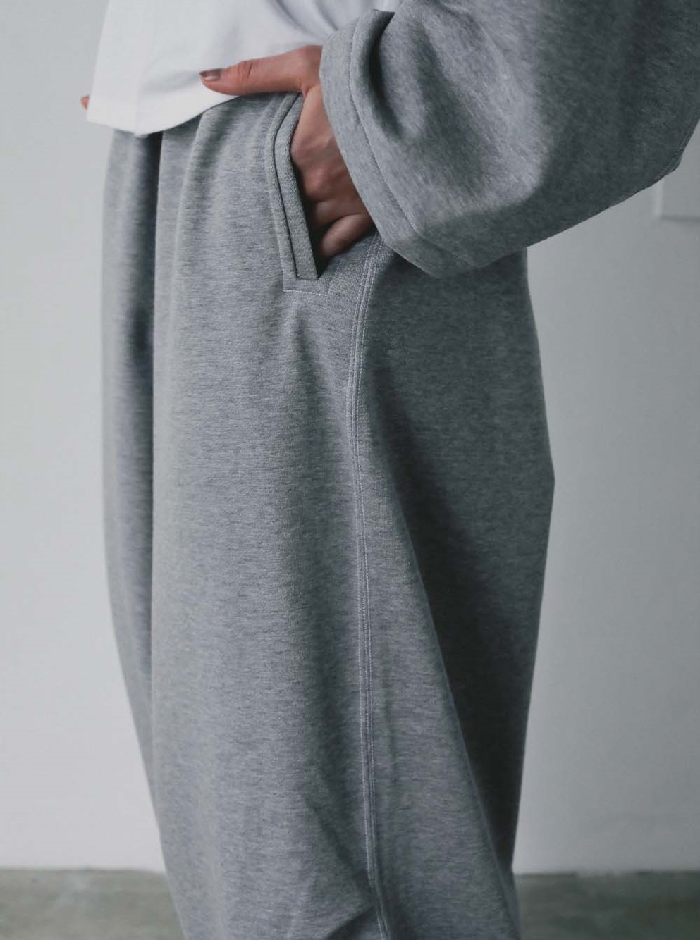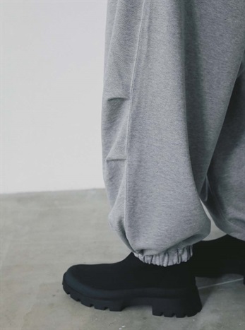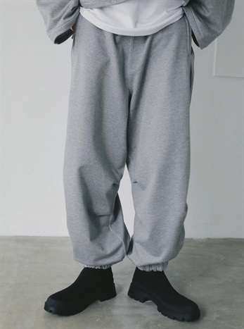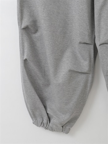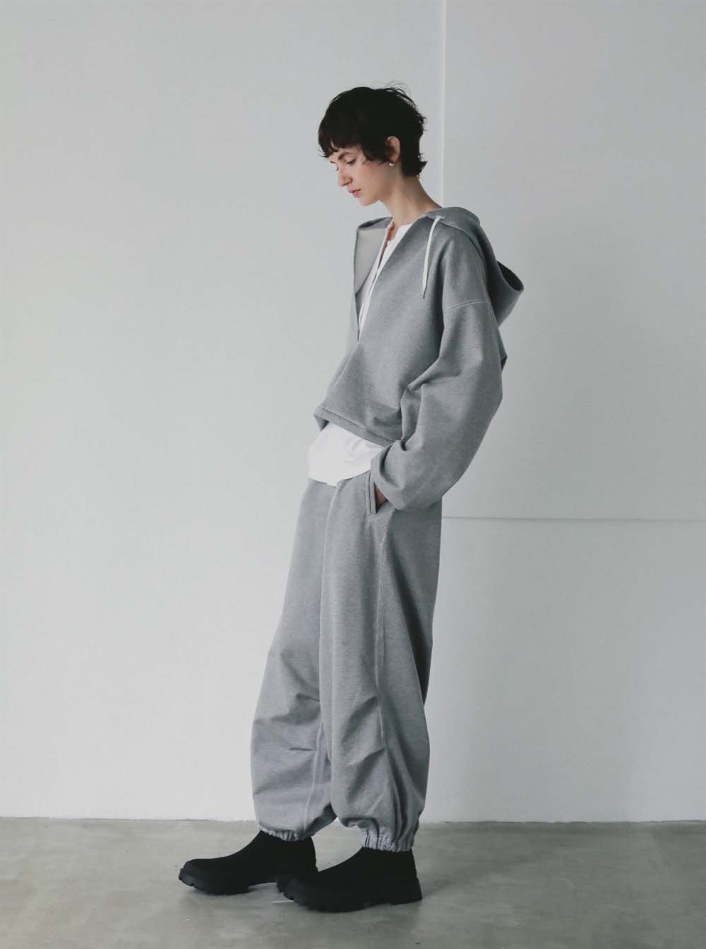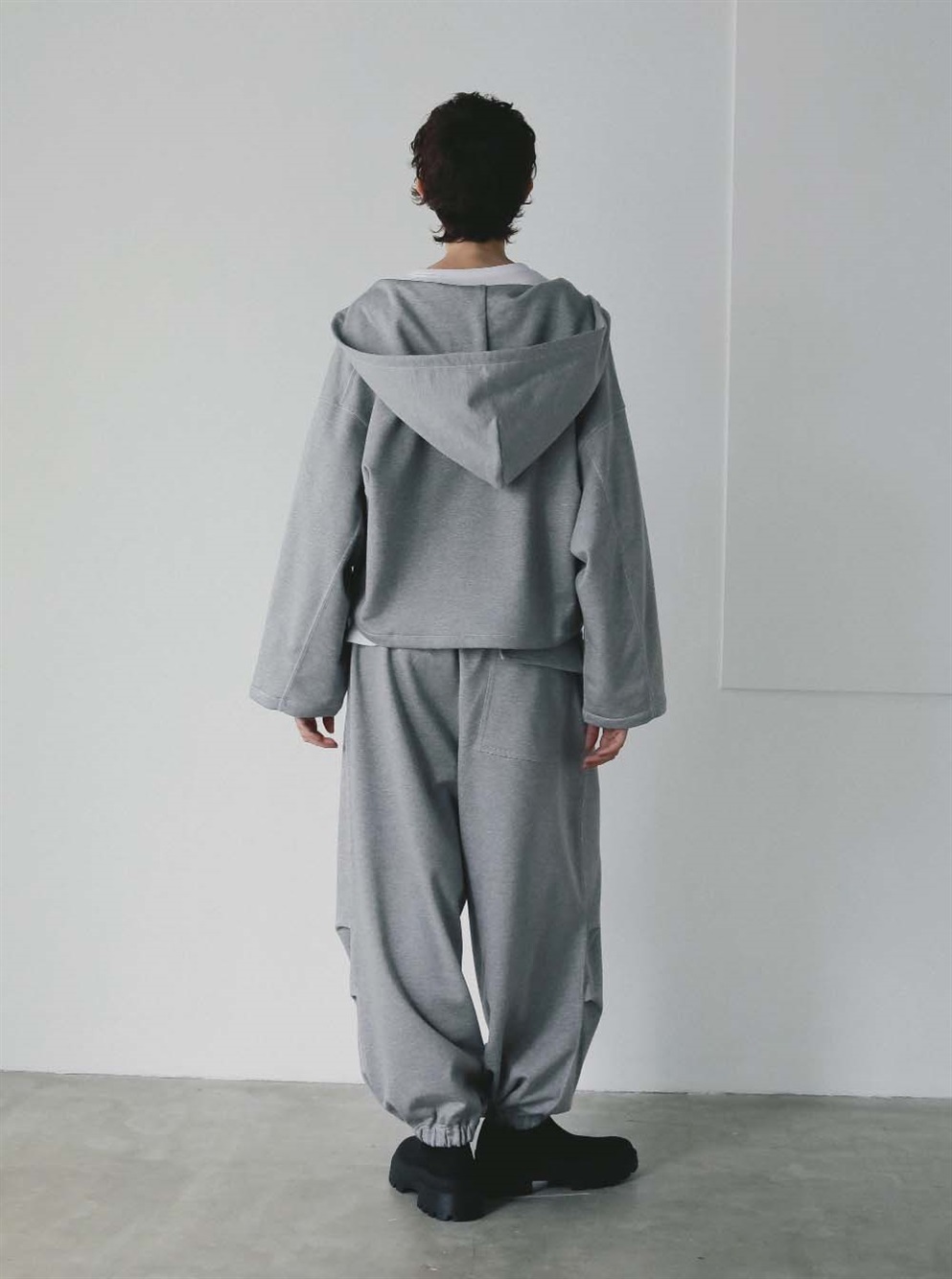 ウエストと裾はゴム仕様でスポーティな作りになっており、膝には深いプリーツを入れたワイドシルエットに仕上げています。 共地のジップアップスエットとのセットアップ提案です。 素材は立ち上がりに適した毛羽の少ないハイゲージ裏毛を使用。