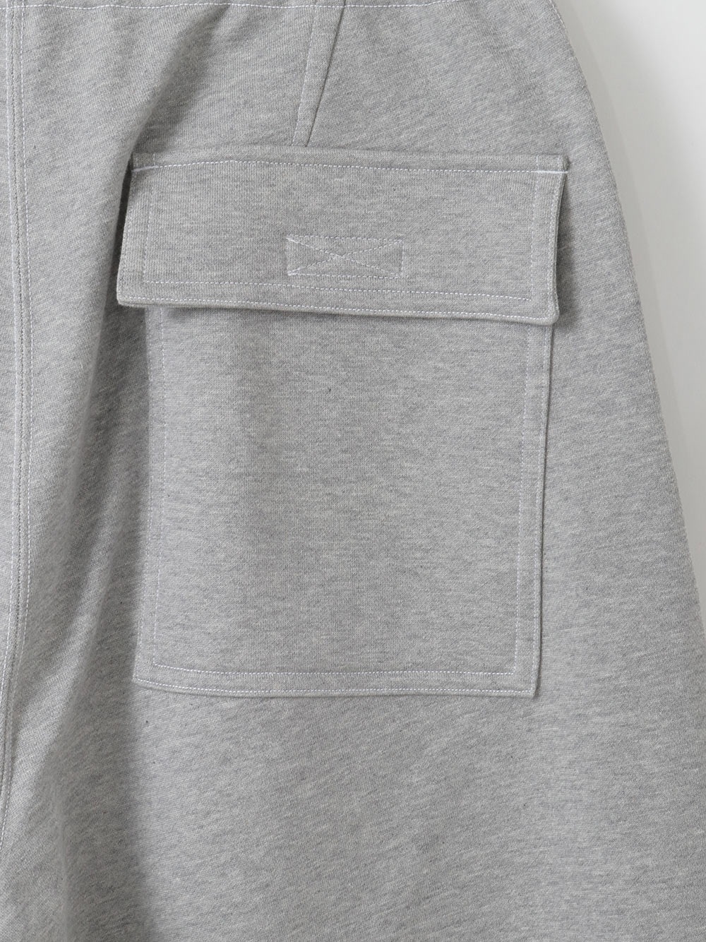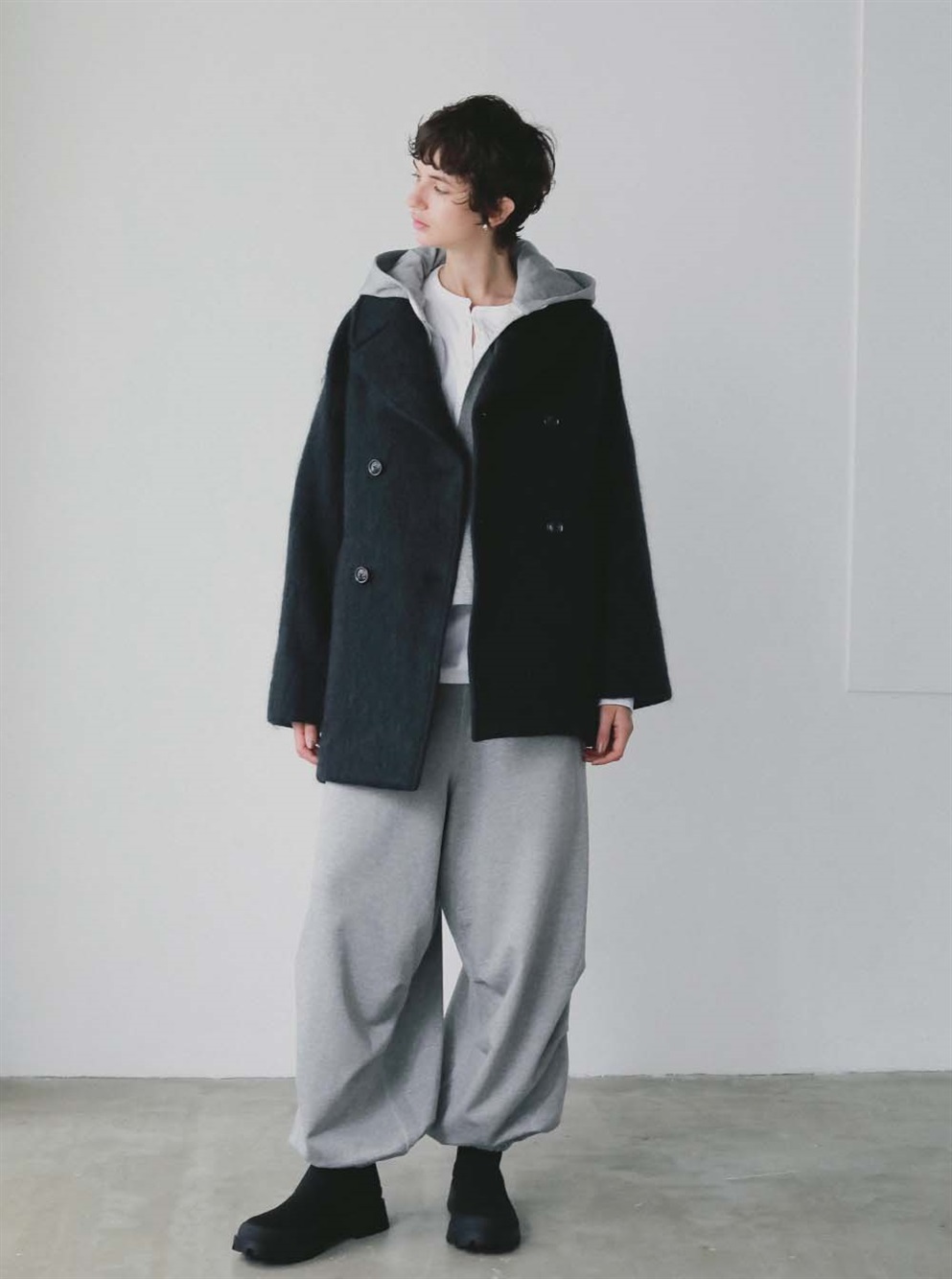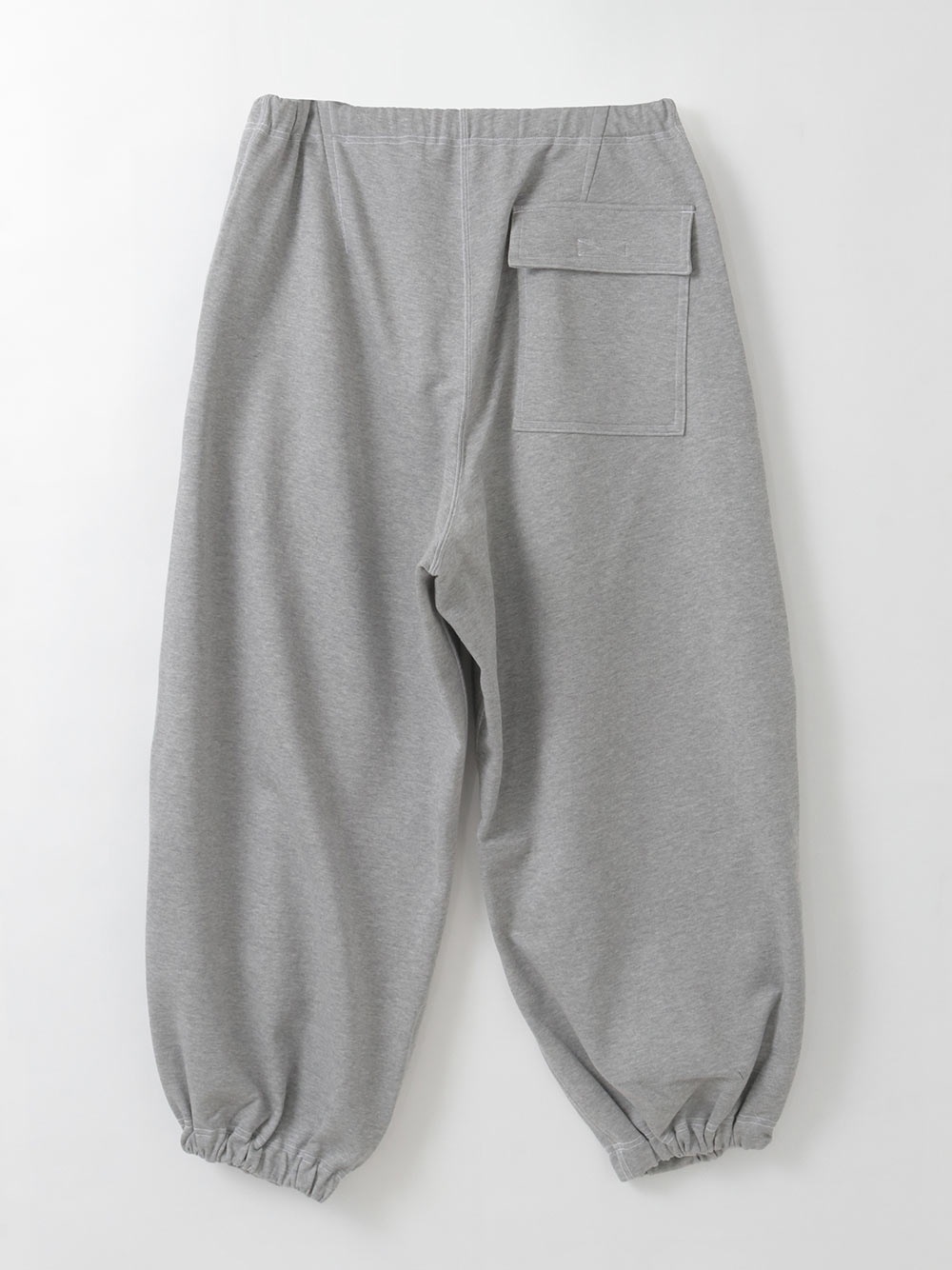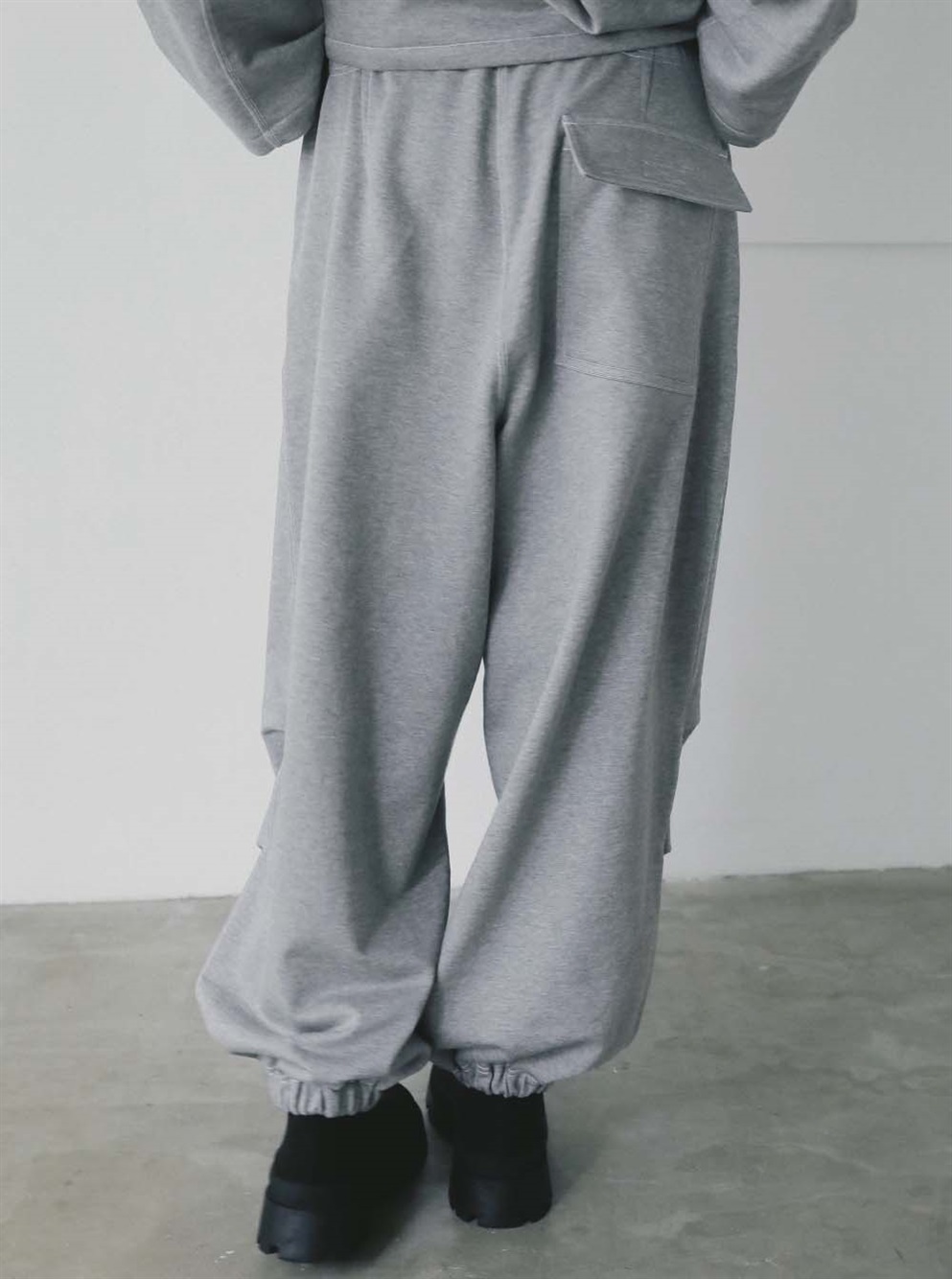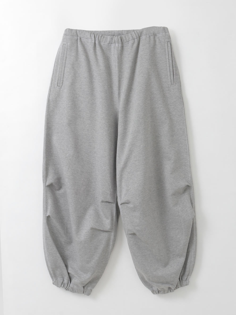 ウエストと裾はゴム仕様でスポーティな作りになっており、膝には深いプリーツを入れたワイドシルエットに仕上げています。 共地のジップアップスエットとのセットアップ提案です。 素材は立ち上がりに適した毛羽の少ないハイゲージ裏毛を使用。