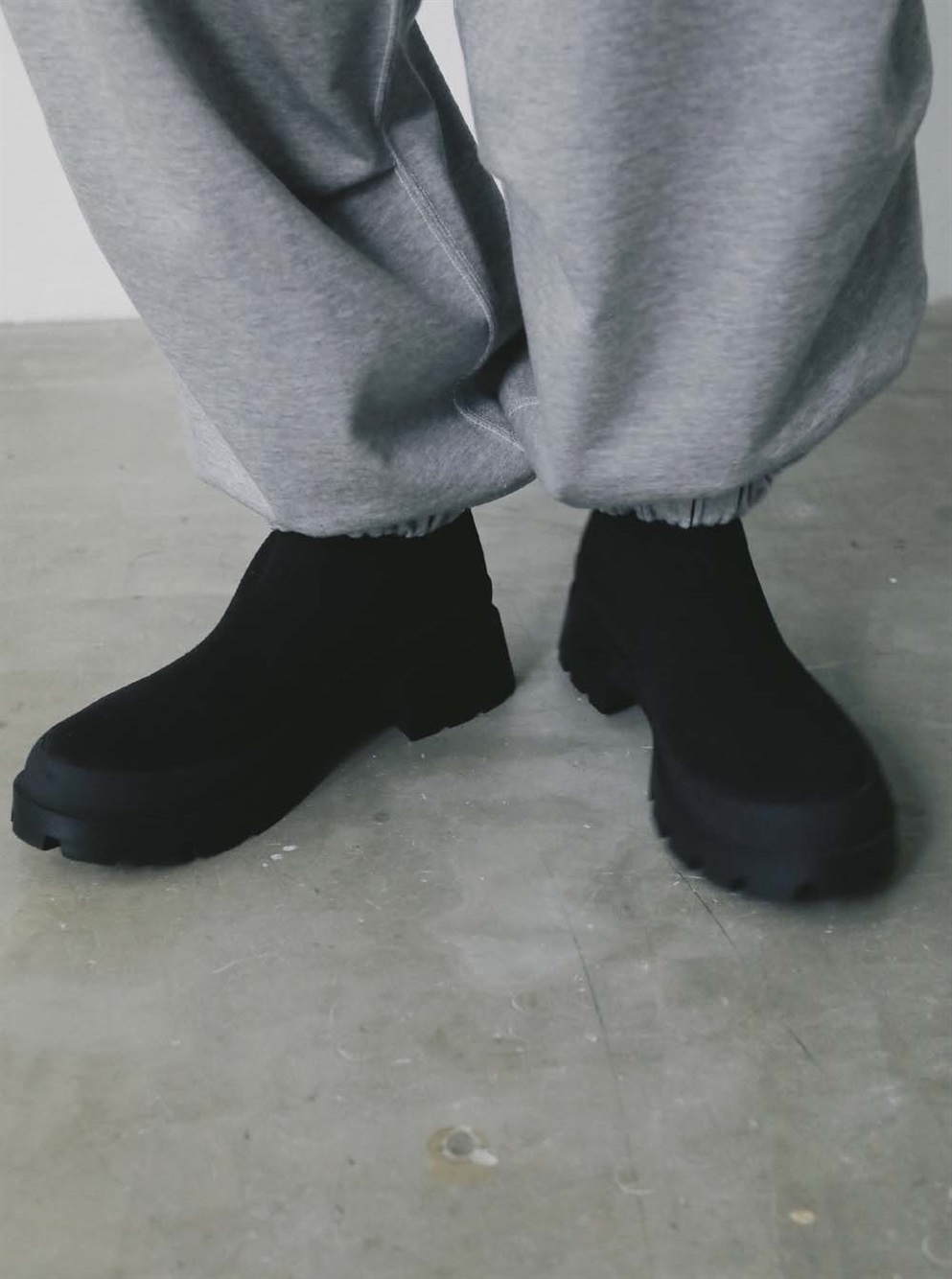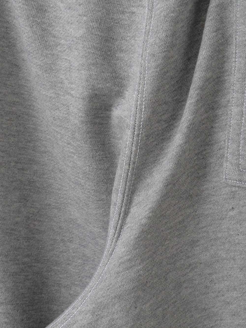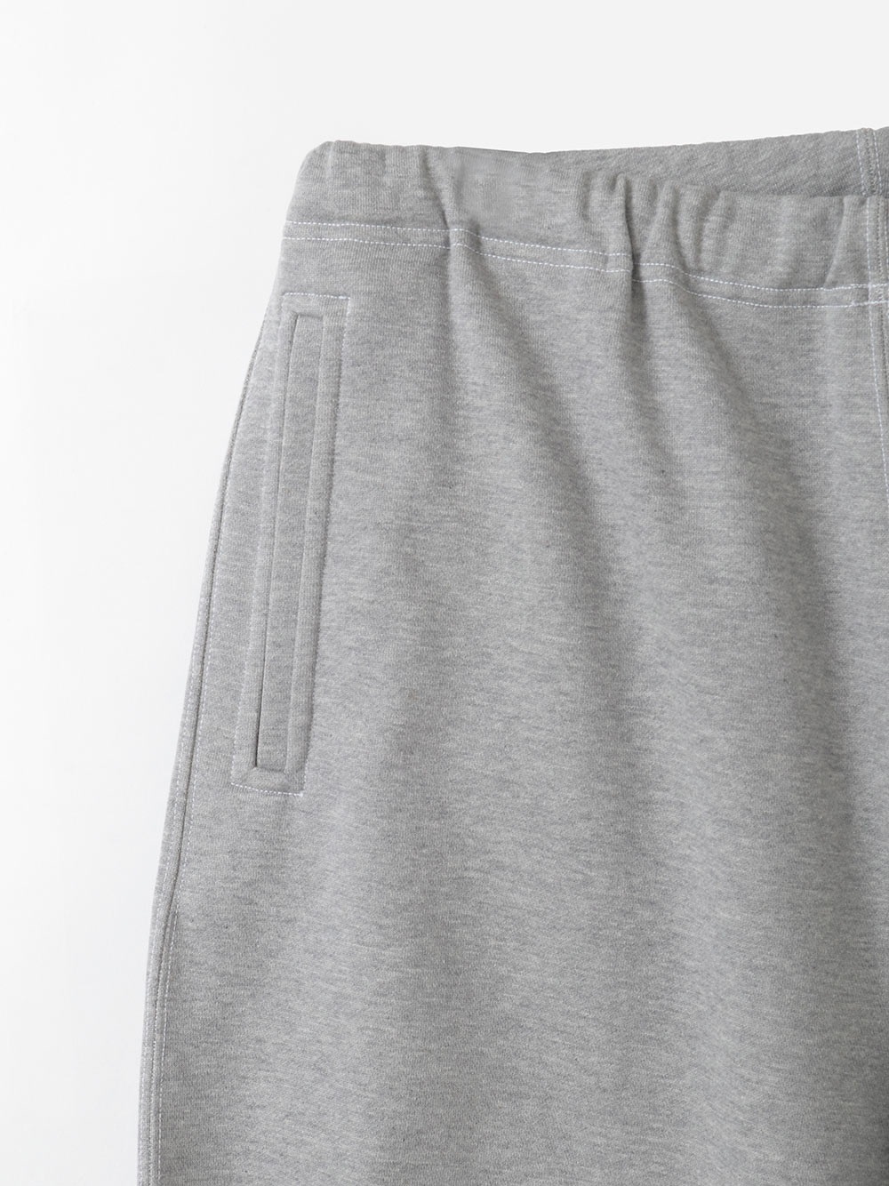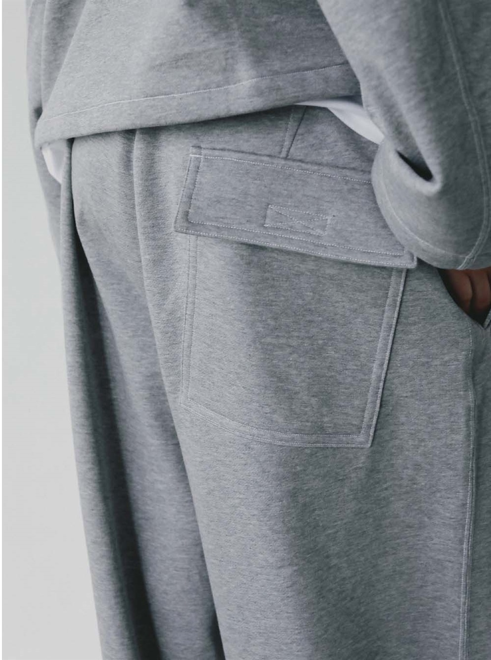 ウエストと裾はゴム仕様でスポーティな作りになっており、膝には深いプリーツを入れたワイドシルエットに仕上げています。 共地のジップアップスエットとのセットアップ提案です。 素材は立ち上がりに適した毛羽の少ないハイゲージ裏毛を使用。