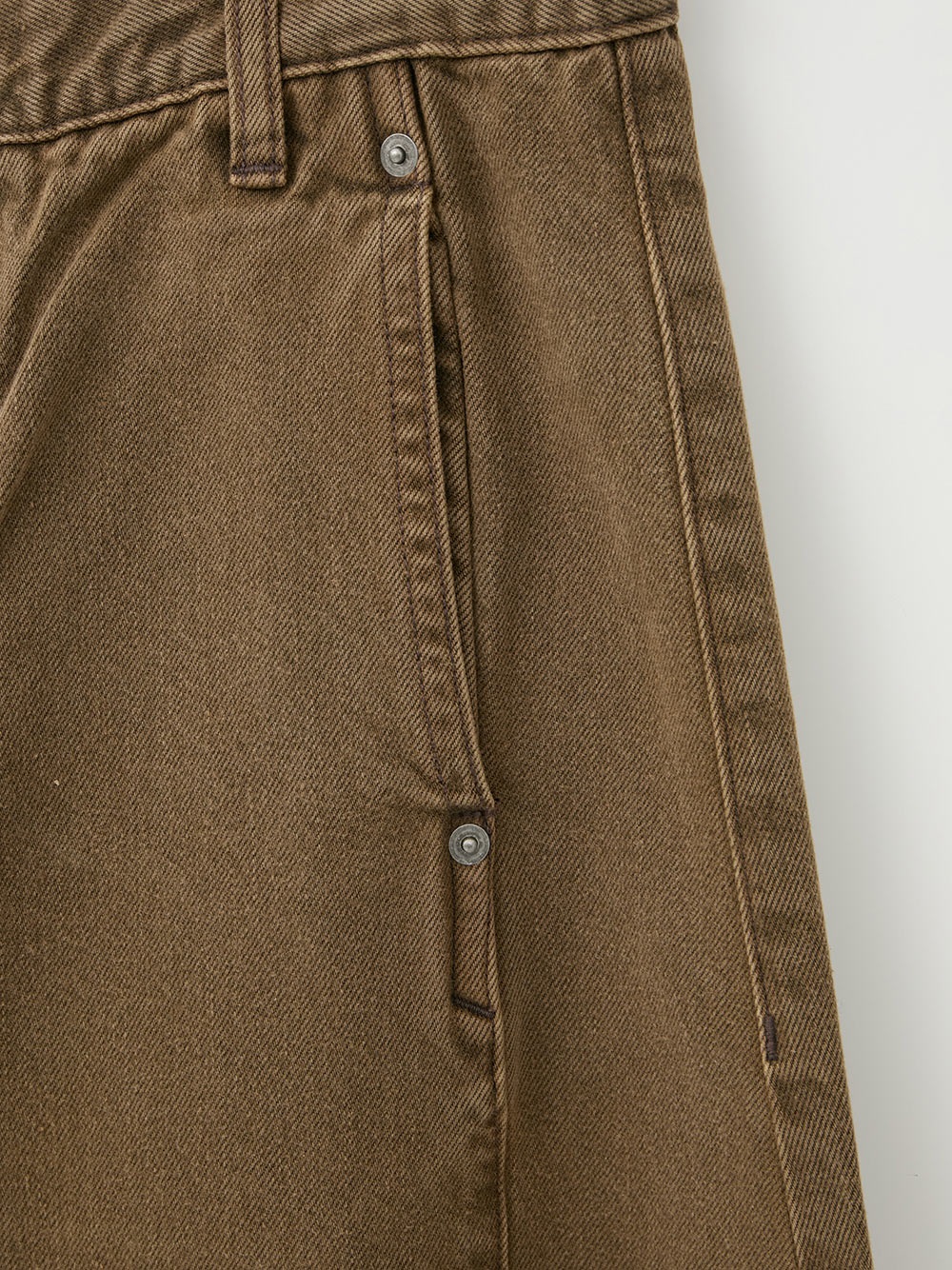 素材にはトルコ産のオーガニックコットンを使用。デニムらしいしっかりとした厚みを保ちつつ、柔らかな肌触りを実現しています。チャコール染料と化学染料を組み合わせたハイブリッド染色によって、独特のムラ感とフェード感のある風合いに仕上げられています。