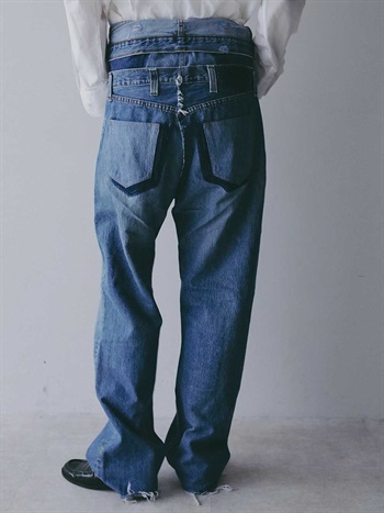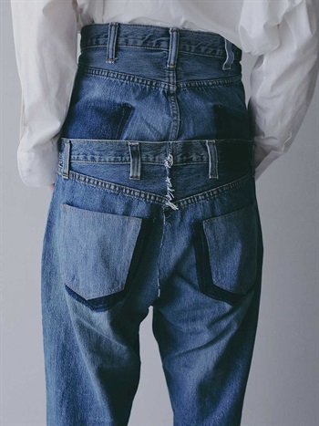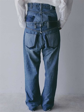 古着とデニム糸を使用し、オリジナルテキスタイルを組み合わせて作成した生地の、デニムパンツです。