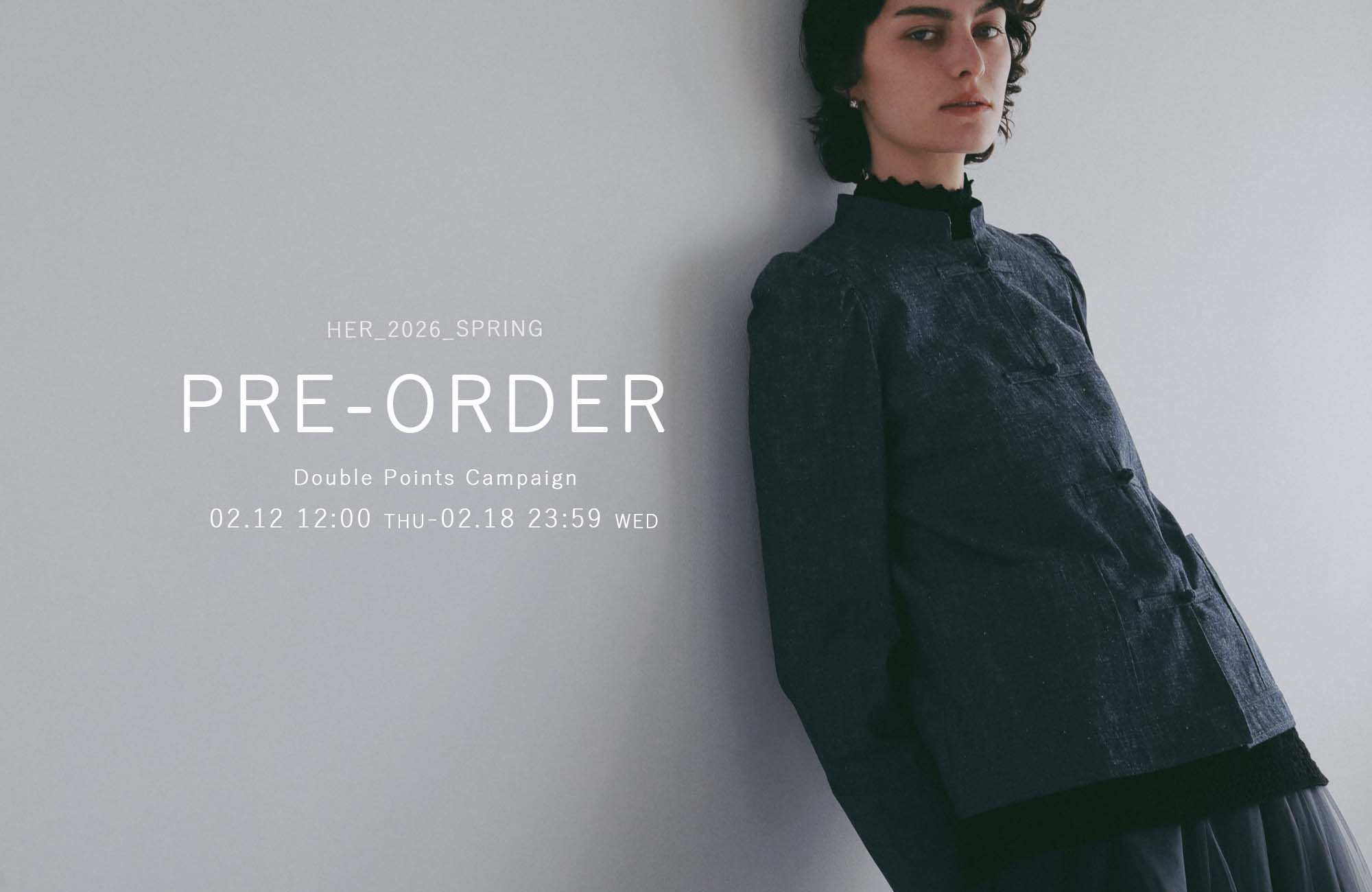 【2026 SPRING PRE ORDER】 3月の新作をいち早くご覧いただける、 オンライン限定予約会がスタート。 期間中、ご予約対象商品をオンラインストアにて購入いただくと、 通常時のポイントから< 2倍のポイント >をお付け致します。 今だけの特典とともに、春の装いをお選びください。 ー期間ー 2026年2月12日(木)12時~ 2026年2月18日(水)23時59分 ※ポイント付与には会員登録が必要です。新規会員登録、またはログインの上お買い上げください。 ※Wポイントの追加分は、商品の発送完了後に付与されます。 ※付与されたポイントは1ポイント1円にてご利用可能です。